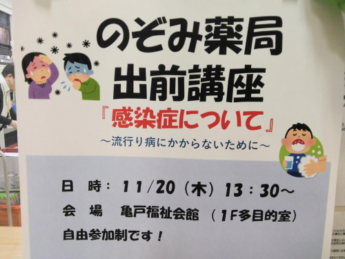 2025.11.21 のぞみ薬局出前講座「感染症について」が開催されました 活動報告 #亀戸福祉会館 #のぞみ薬局 #感染症予防 #冬の健康管理 2025.09.20 のぞみ薬局出前講座が開催されました 活動報告 #亀戸福祉会館 #のぞみ薬局 #アロマ #石鹼作り 2025.06.14 のぞみ薬局出前講座が開催されました 活動報告 #亀戸福祉会館 #のぞみ薬局 #低栄養 #高齢者