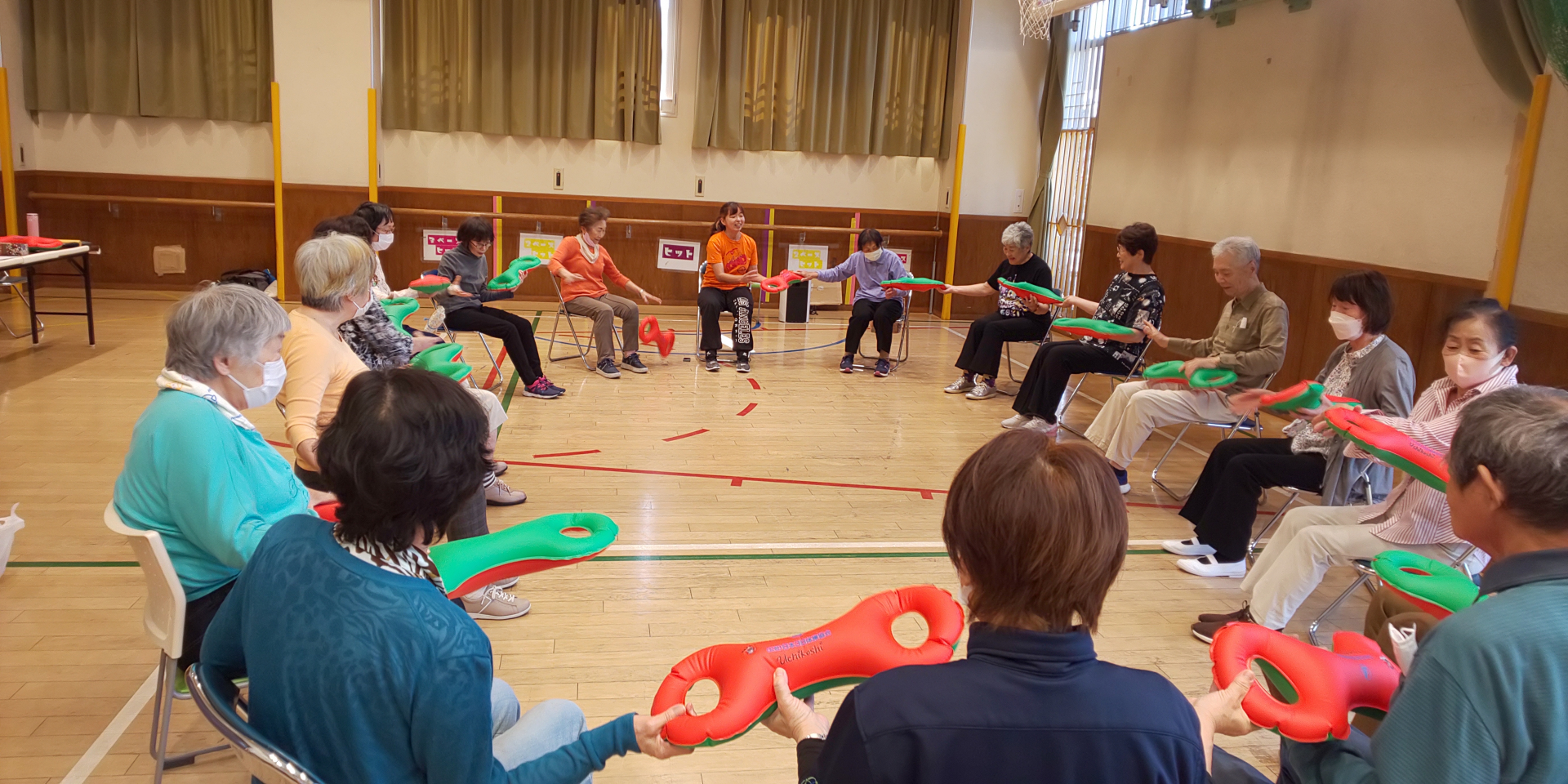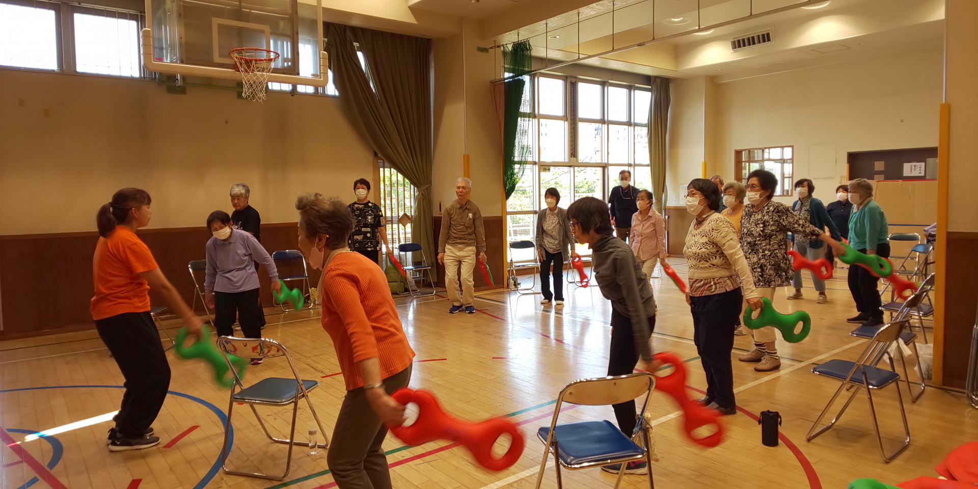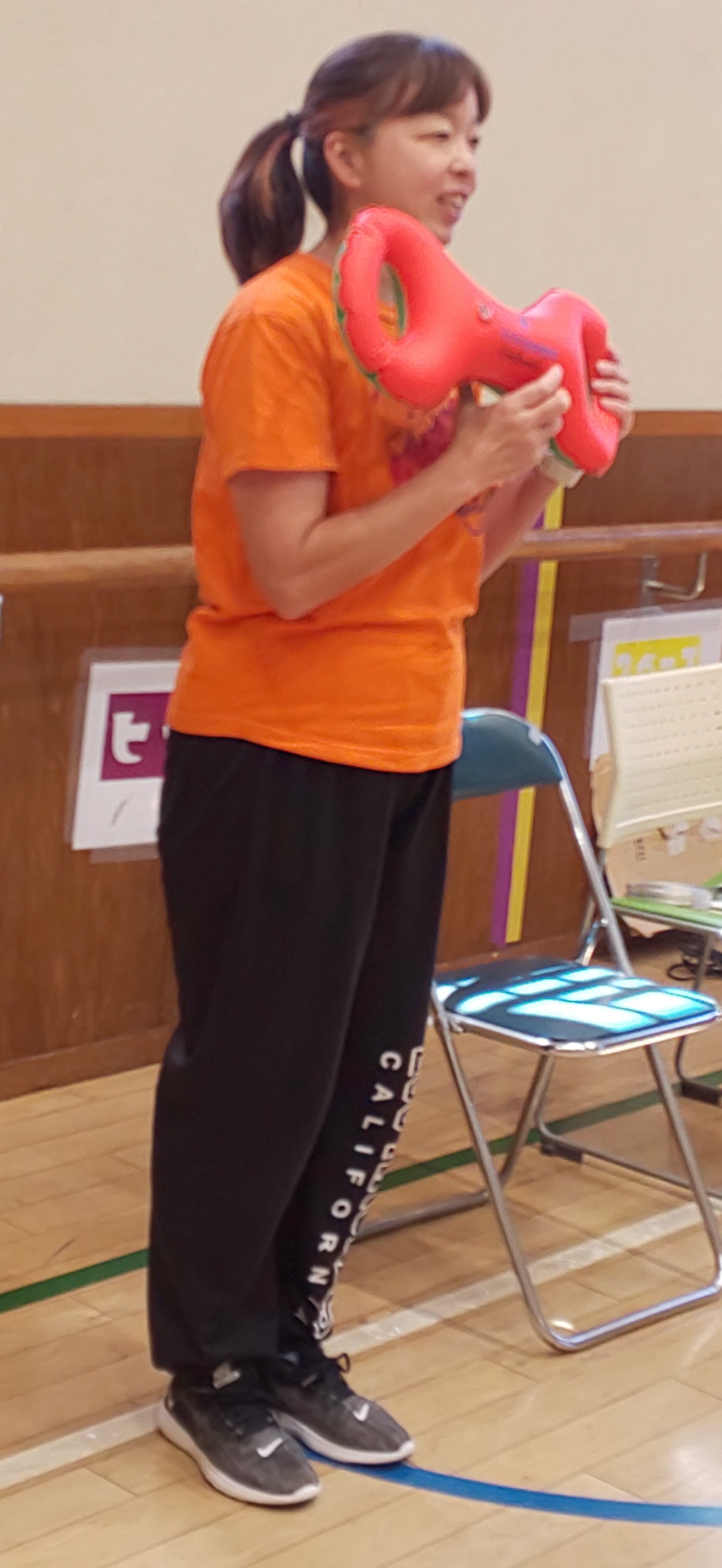 打越先生は3B体操の講師であり、リズム体操は3B体操(ベル・ボール・ベルダーを使って行う体操)の要素を取り入れながら、音楽に合わせて行う体操です。