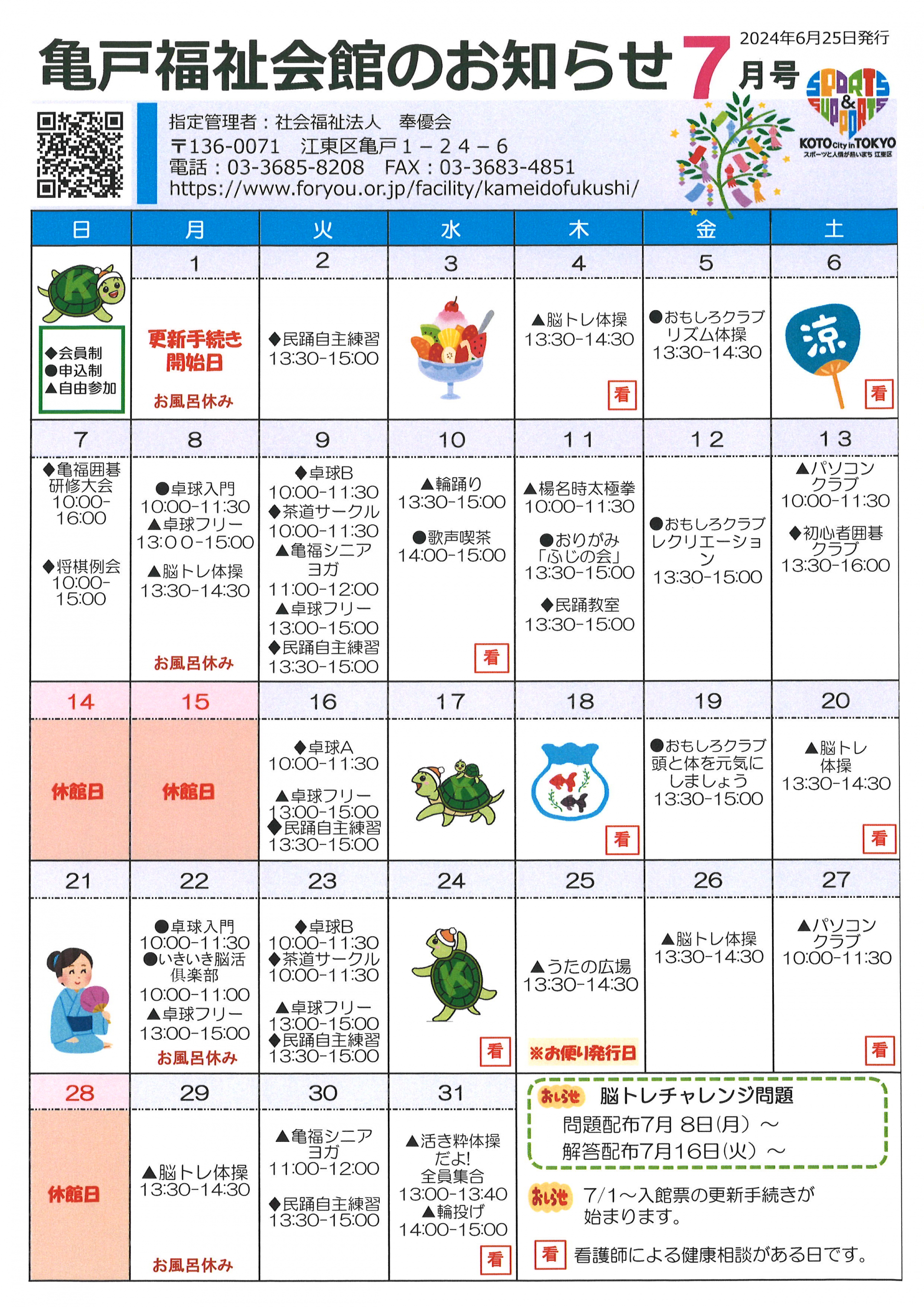 2024.06.25 ニュース 亀戸福祉会館のお知らせ7月号 Tweet シェアする 様、こんにちは亀戸福祉会館のお知らせ7月号 が出来上がりました!是非、お越しください(^O^)/ 亀戸福祉会館 前の記事 2024.06.29 ニュース 亀福再開記念イベントの風景 次の記事 2024.06.19 ニュース 再開記念イベントを開催しました! 一覧へ戻る
