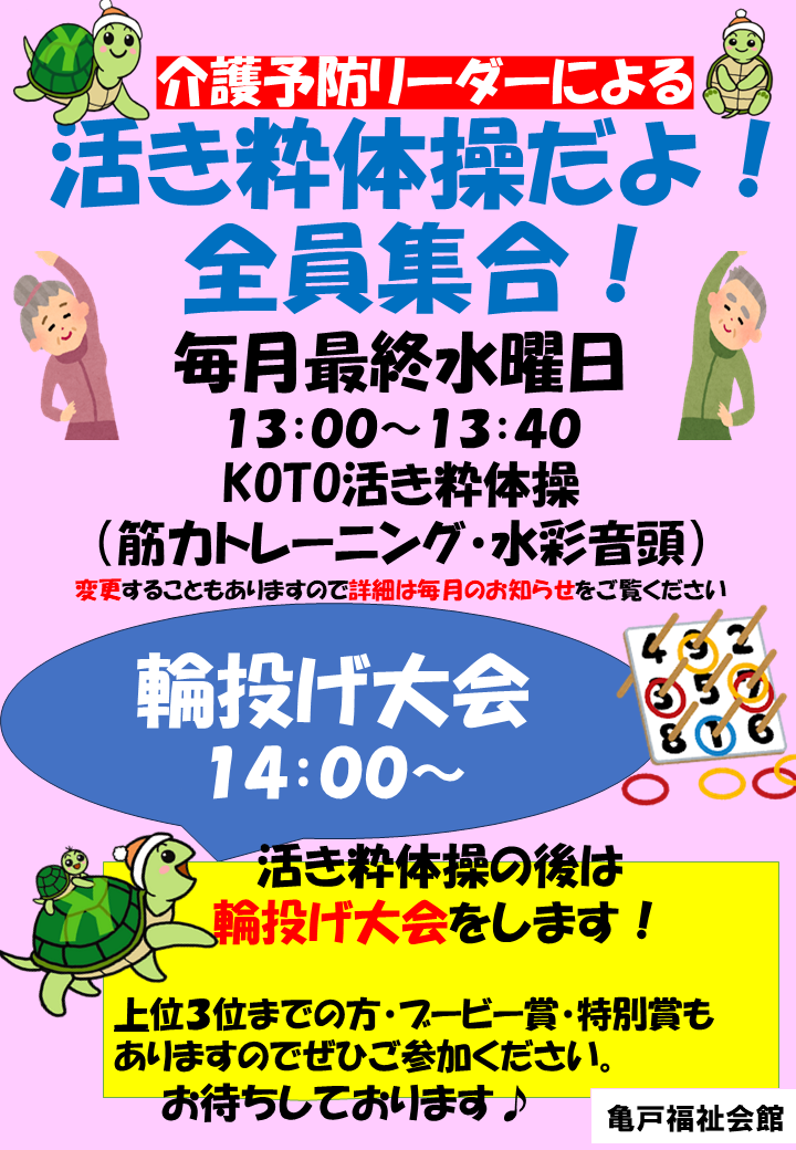 2024.08.05 お知らせ 活き粋体操だよ!全員集合!&輪投げ! Tweet シェアする 活き粋体操して 輪投げも楽しみましょう!(^^)! 8月は28日(水)です。 ぜひご参加くださいませ。 お待ちしておりますm(__)m 亀戸福祉会館 m.t 前の記事 2024.08.05 お知らせ 輪踊りが始まりました! 次の記事 2024.08.03 お知らせ 申込み不要になったよ!亀福シニアヨガ 一覧へ戻る