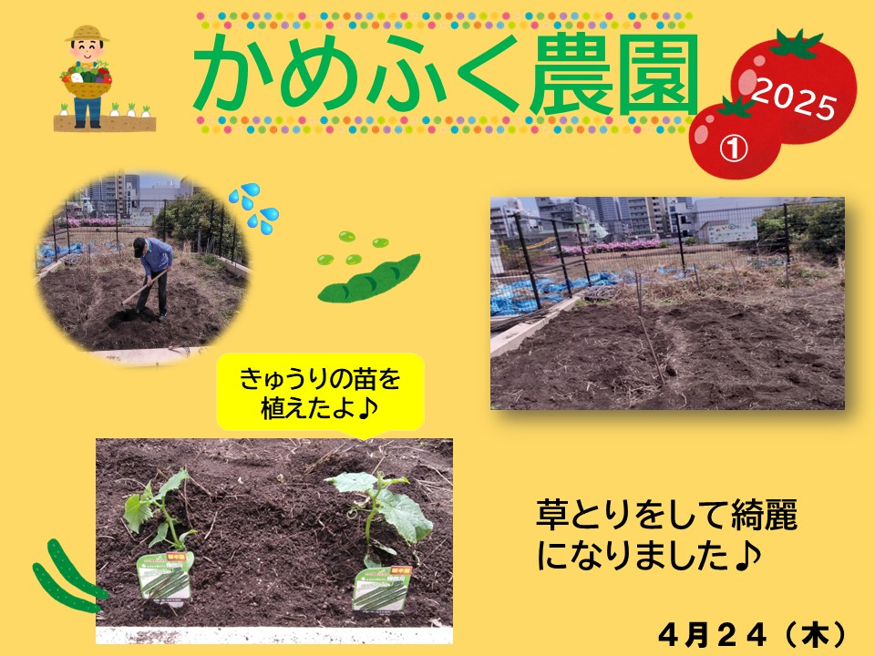 【かめふく農園】が4月24日開園しました♪草がぼうぼうに生えていたのですが、少しずつボランティアのお二人と一緒に草取りをして苗や種を植えられるように準備しました。その様子をご覧ください♪