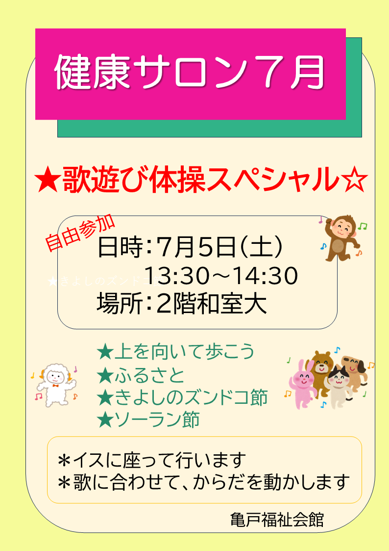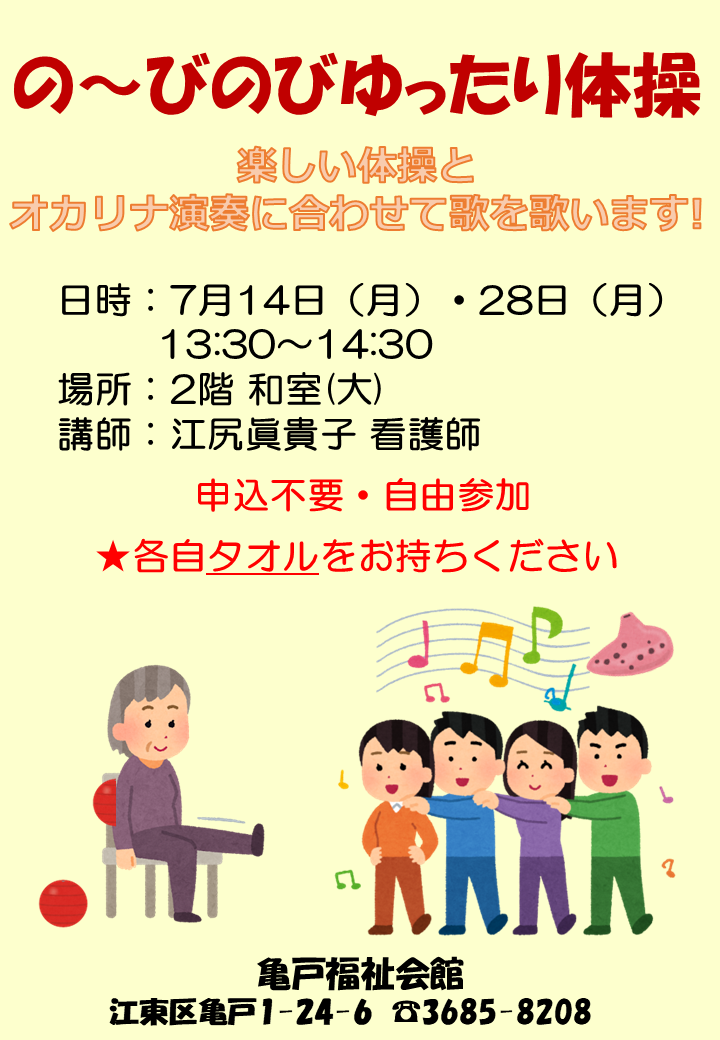 2025.06.30 お知らせ 亀福・看護師による講座(健康体操)のお知らせ Tweet シェアする 亀戸福祉会館・看護師による人気講座をご紹介します。身体を動かしたり、歌を唄ったり楽しい講座です。自由参加ですので是非お越しください。 亀戸福祉会館 Y.H #江東区 #亀戸福祉 #講座 #体操 前の記事 2025.07.02 お知らせ 亀福シニアヨガ」が開催されました 次の記事 2025.06.30 お知らせ 亀戸福祉会館 ✨✨令和7年7月7日七夕 ✨✨ 一覧へ戻る