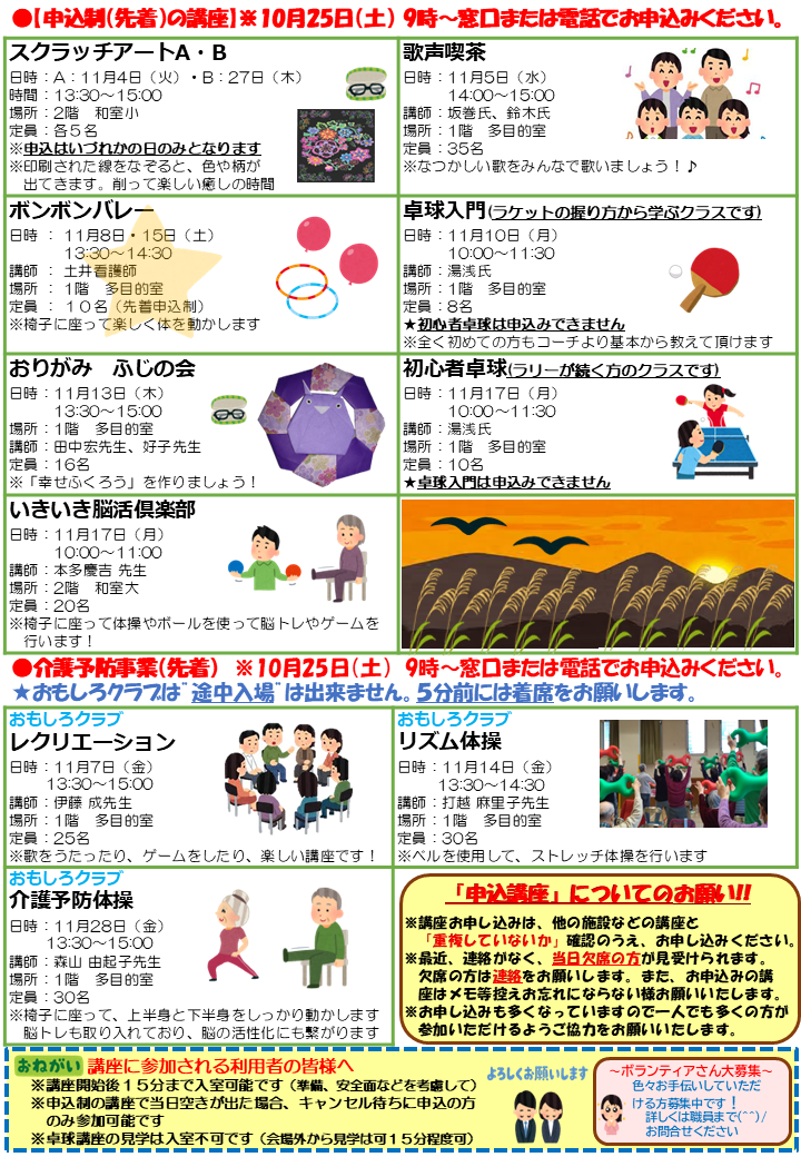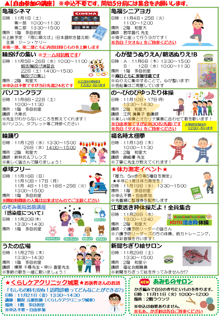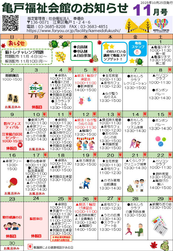 2025.10.25 お知らせ お知らせ11月号を発行しました! Tweet シェアする #亀戸福祉会館 #お知らせ 前の記事 2025.10.25 お知らせ 第25回悠々フェスティバルが開催されます! 次の記事 2025.10.23 お知らせ 【いきいき脳活俱楽部】が開催されました 一覧へ戻る