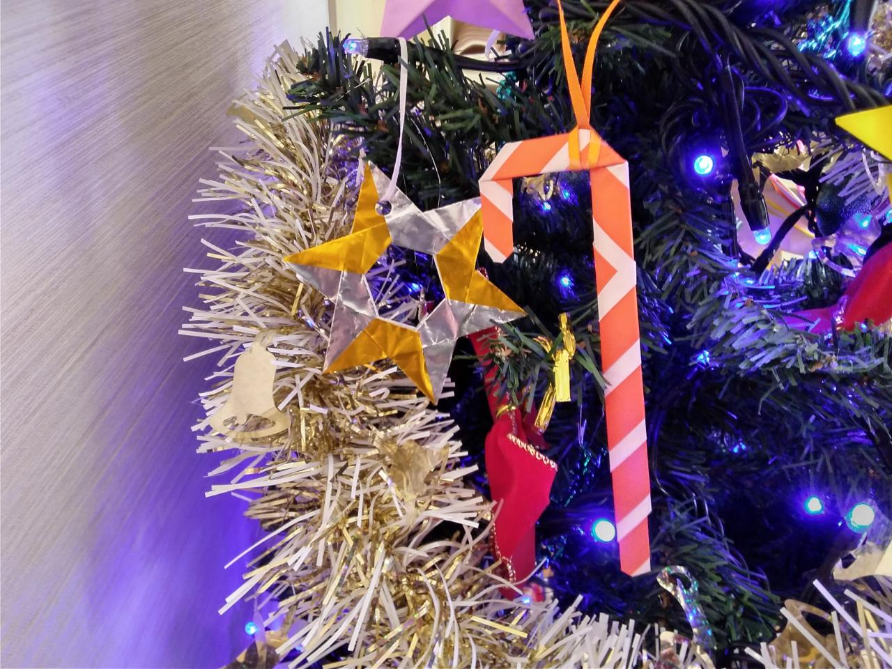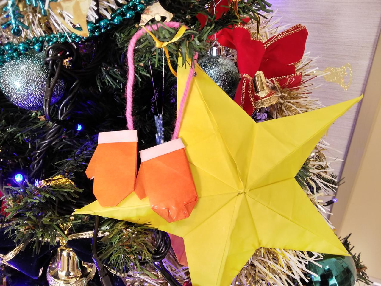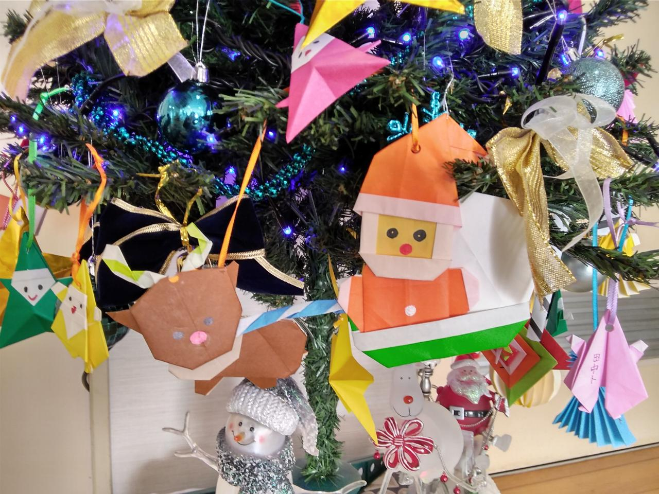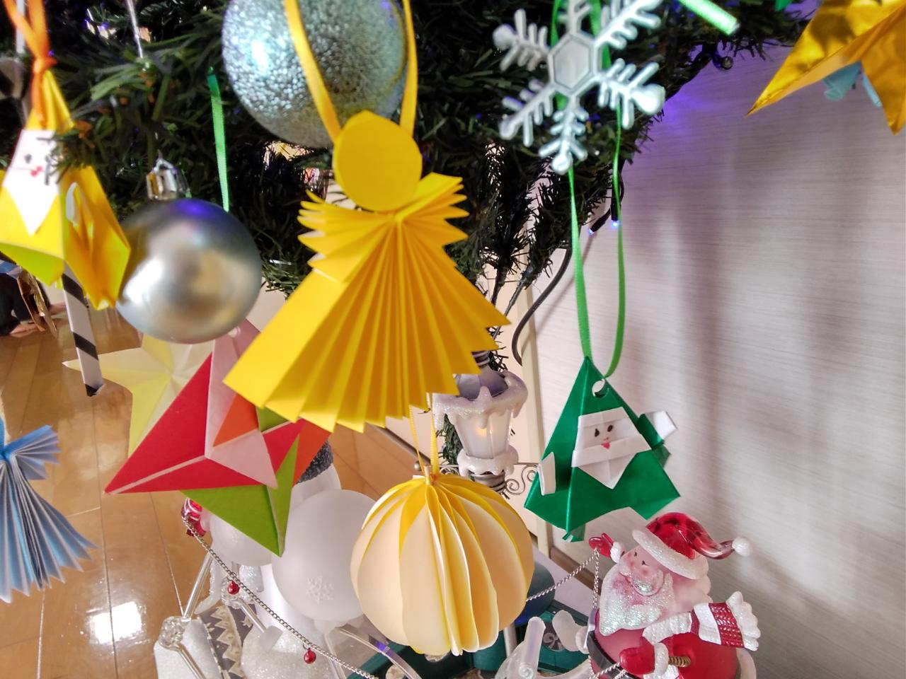 折り紙で思い思いの作品が出来上がり、思った以上に華やかなツリーに!!