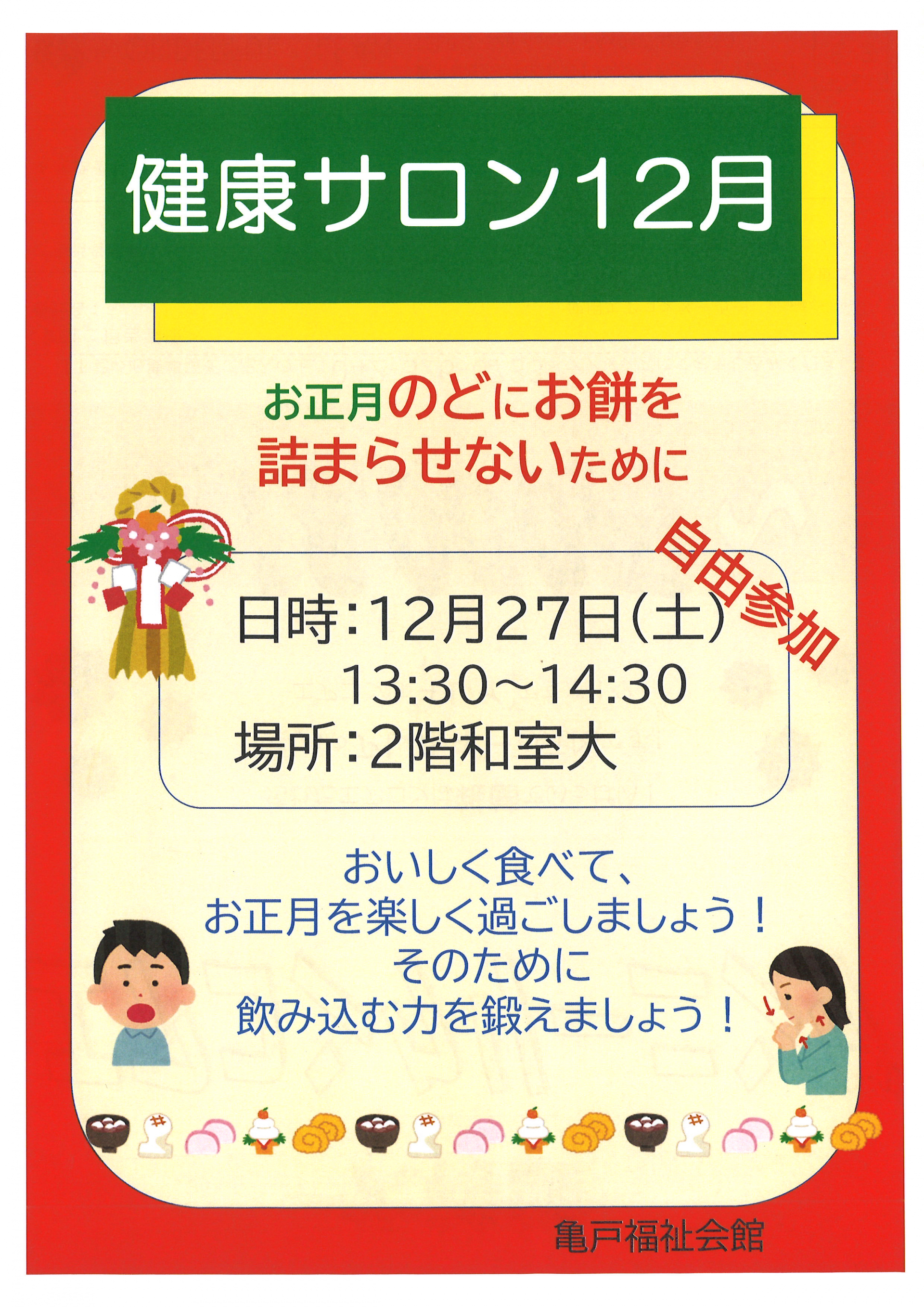 今月の「健康サロン」のテーマは、『お正月のどにお餅を詰まらせないために』です。