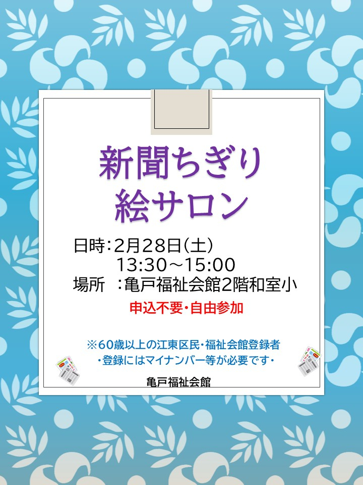 2026.02.25 お知らせ 新聞ちぎり絵サロン開催します! Tweet シェアする 2月28日(土)13:30~ 【新聞ちぎり絵サロン】を開催します。亀戸福祉会館一同お待ちしてます♪亀戸福祉会館 M.K #亀戸福祉会館 #新聞ちぎり絵 前の記事 2026.02.26 お知らせ さくら🌸さくら 次の記事 2026.02.25 お知らせ 亀戸福祉会館 お知らせ3月号を発行しました! 一覧へ戻る