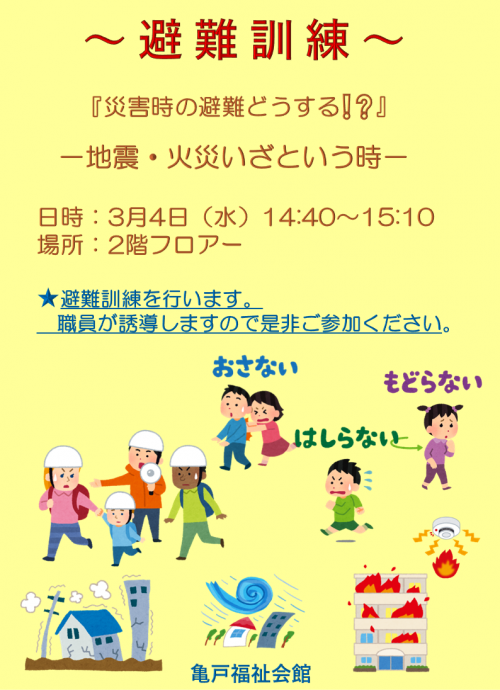 2026.03.02 お知らせ NEW eスポーツ開催のお知らせ Tweet シェアする 初めての講座です。今流行りの「eスポーツ」です。ゲームで身体を動かし楽しんでみませんか! 亀戸福祉会館 Y.H 前の記事 2026.03.02 お知らせ 【避難訓練】を実施します! 次の記事 2026.03.02 お知らせ チョコレートの世界へようこそ! 一覧へ戻る