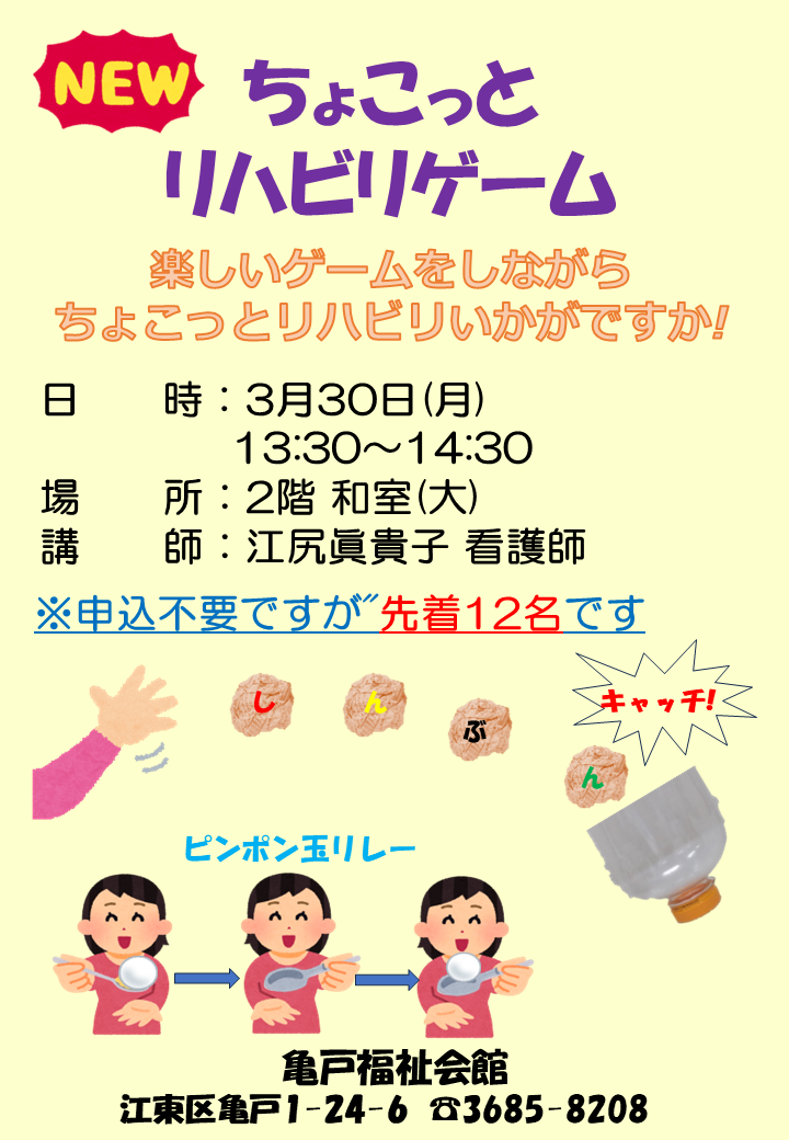 2026.03.06 お知らせ NEW ちょこっとリハビリゲームいかがですか! Tweet シェアする あたらしい講座です。当館担当の看護師さんが開催する講座です。「ちょこっとリハビリゲーム」で楽しい体験してみませんか! 亀戸福祉会館 Y.H 前の記事 2026.03.07 お知らせ 【交通安全講話】が開催されました 次の記事 2026.03.06 お知らせ ウクレレコンサートが開催されました🌴 一覧へ戻る