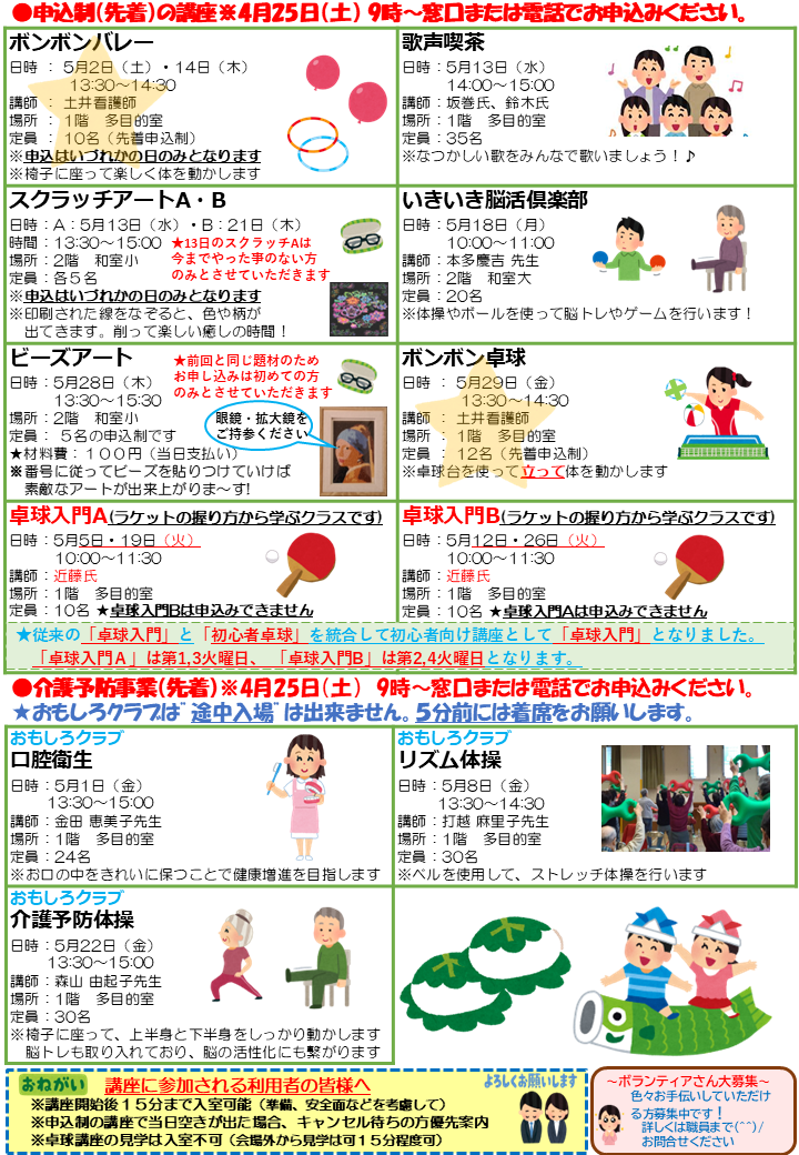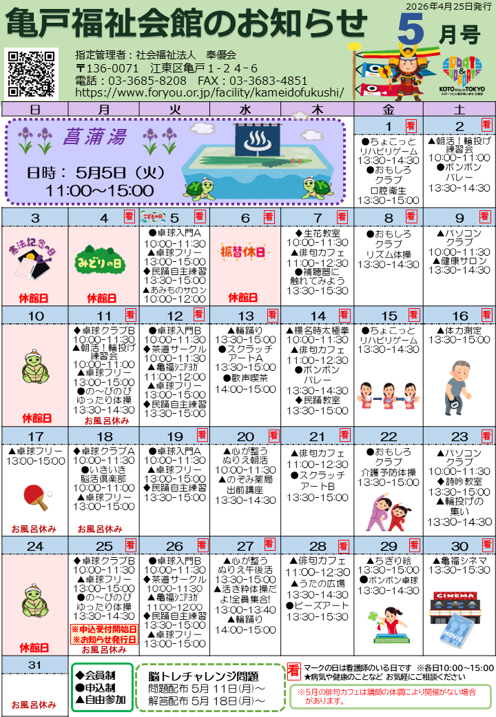 2026.04.25 お知らせ 亀戸福祉会館 お知らせ5月号を発行しました! Tweet シェアする 前の記事 2026.04.27 お知らせ 【詩吟教室】が開催されました 次の記事 2026.04.23 お知らせ ちょこっとリハビリゲーム 一覧へ戻る