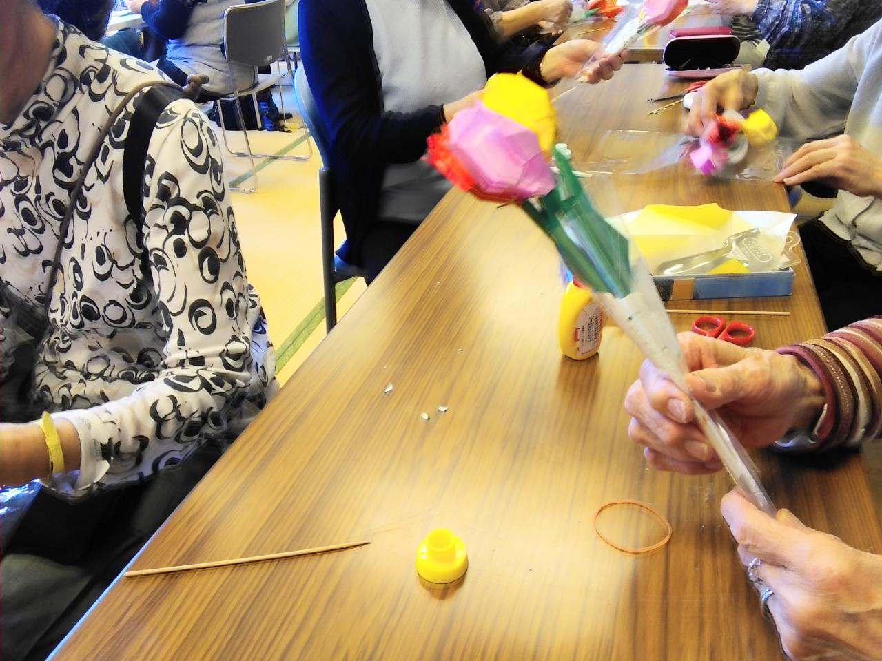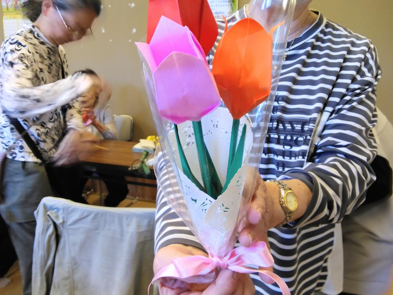 花・葉・茎を折ってチューリップを完成させ、束ねてレースペーパーとセロファン紙でラッピング