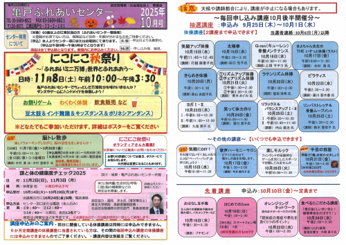 2025.10.03 祝!!ドリかめ手帳100個達成 活動報告 2025.10.02 やさしいウクレレ教室の最終回が行われました。 活動報告 2025.09.25 10月自由参加日程表【ゆうゆう体操、カラオケ自由開放、卓球自由開放】 お知らせ 2025.09.25 2025年亀戸ふれあいセンター10月号予定表 お知らせ 2025.09.25 2025年亀戸ふれあいセンター10月号おたより お知らせ 2025.09.24 楽しモルック 開催しました! 活動報告 2025.09.22 10月前半毎回申込講座・3ヶ月講座 追加募集のご案内 お知らせ 2025.09.22 10月前半毎回申込講座 当選連絡その2【その他の講座】【3ヶ月講座】 お知らせ 2025.09.22 10月前半開催の毎回申込み講座の当選発表 お知らせ 2025.09.20 9月はアルツハイマー月間です。 活動報告 2025.09.19 祝!ドリかめスタンプ700個達成☆ 活動報告 2025.09.18 白熱しました!【4館合同eスポーツ大会】 活動報告 2025.09.15 祝‼ドリかめ手帳1200個達成 活動報告 2025.09.13 R7年秋の定期講座の追加募集 活動報告 2025.09.11 令和7年度 秋の定期講座(10月~R8.3月)の当選連絡のお知らせ お知らせ 1 2 3 … 44