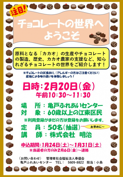 2026.01.26 カレンダー配布のご案内 お知らせ 2026.01.26 2月自由参加日程表【ゆうゆう体操、カラオケ自由開放、卓球自由開放】 活動報告 2026.01.25 募集開始しました♬ 『チョコレートの世界へようこそ』 を開催しま~す お知らせ 2026.01.24 2026年亀戸ふれあいセンター2月号予定表 お知らせ 2026.01.24 2026年亀戸ふれあいセンター2月号おたより お知らせ 2026.01.23 2月前半毎回申込講座 追加募集のご案内 お知らせ 2026.01.23 2月前半毎回申込講座 当選連絡その2【その他の講座】 お知らせ 2026.01.23 2月前半開催の毎回申込み講座の当選発表 お知らせ 2026.01.22 祝ドリかめ手帳700個達成 活動報告 2026.01.22 祝!!ドリかめスタンプ1300個達成!!! 活動報告 2026.01.21 折り紙でポチ袋折りました(^^) 活動報告 2026.01.16 祝‼ドリかめ手帳300個達成☆ 活動報告 2026.01.15 詩吟発表会♪【詩吟の世界を知ろう】 活動報告 2026.01.14 ドリかめスタンプ900個達成者のご紹介 活動報告 2026.01.14 祝‼ドリかめ手帳700個達成~☆彡 活動報告 1 2 3 … 49