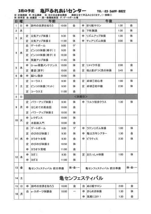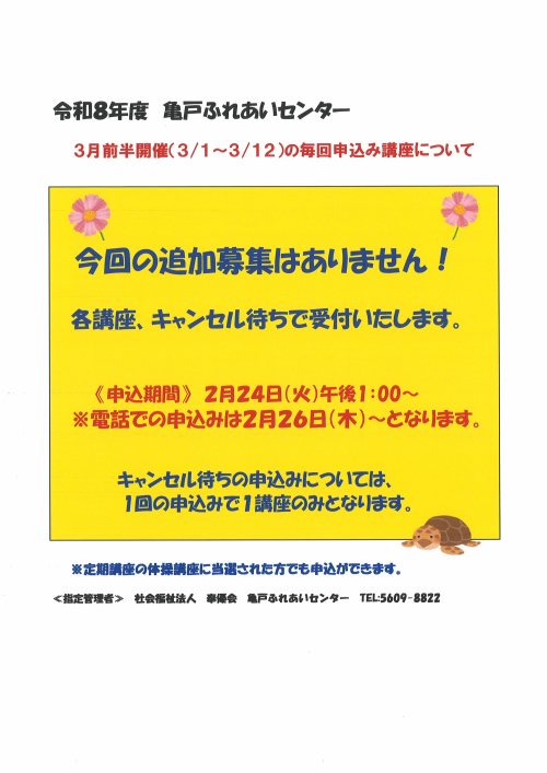 2026.03.11 R8年 春の定期講座の追加募集 お知らせ 2026.03.10 令和8年度 春の定期講座(4月~9月)の当選連絡のお知らせ お知らせ 2026.03.07 3月後半毎回申込講座 追加募集のご案内 お知らせ 2026.03.07 3月後半毎回申込講座 当選連絡その2【その他の講座】 活動報告 2026.03.07 3月後半開催の毎回申込み講座の当選発表 活動報告 2026.03.05 春の定期講座、大抽選中!! お知らせ 2026.03.05 楽しい簡単スィーツ作り♬ 活動報告 2026.02.25 2026年亀戸ふれあいセンター3月号予定表 お知らせ 2026.02.25 2026年亀戸ふれあいセンター3月号おたより お知らせ 2026.02.25 3月自由参加日程表【ゆうゆう体操、カラオケ自由開放、卓球自由開放】 お知らせ 2026.02.23 3月前半毎回申込講座 追加募集のご案内 お知らせ 2026.02.23 3月前半毎回申込講座 当選連絡その2【その他の講座】 お知らせ 2026.02.23 3月前半開催の毎回申込み講座の当選発表 お知らせ 2026.02.21 祝ドリかめ手帳100個達成!! 活動報告 2026.02.21 折り紙サロン『ハート💛のリース』を折りました 活動報告 1 2 3 … 51