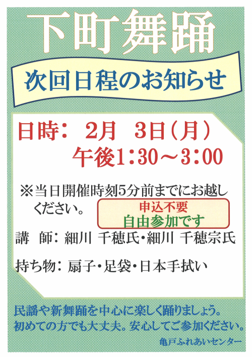 2025.04.18 亀戸名物 ふれあい写真館開店です! 【写真で残そう!思い出の一枚】 活動報告 2025.04.18 祝!ドリかめスタンプ600個達成~!!! 活動報告 2025.04.15 『第4期ワルツ初歩クラス』終了しました! 活動報告 2025.04.15 オレンジフェスティバルのご報告☆彡 e-sportsコーナー 活動報告 2025.04.14 祝‼ドリかめ手帳500個達成 活動報告 2025.04.14 令和6年度~詩吟の世界を知ろう~後期講座修了しました♪ 活動報告 2025.04.13 令和6年度ご利用者満足度アンケート結果報告 お知らせ 2025.04.11 防災講座を開催いたしました! 活動報告 2025.04.09 ~布・新聞ちぎり絵サロン~3月24日開催しました♪ 活動報告 2025.04.09 楽しくておいしい ふれあい食堂 活動報告 2025.04.07 4月後半開催毎回申込講座 追加募集のご案内 お知らせ 2025.04.07 4月後半開催毎回申込講座 当選連絡その2【その他の講座】 お知らせ 2025.04.07 4月後半開催毎回申込講座 当選連絡その1【体操講座】 お知らせ 2025.04.05 祝!ドリかめ手帳スタンプ500個達成! 活動報告 2025.04.05 亀センフェスティバル ~ステージ発表④~ 活動報告 1 … 9 10 11 12 13 … 46
