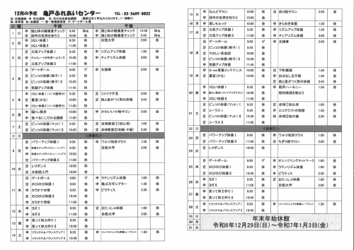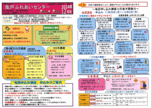 2024.11.27 東京有明医療大学看護学生さんいらっしゃ~い② 活動報告 2024.11.27 ~ふくろう(くろう知らず)の壁飾り~ 活動報告 2024.11.26 ~にこにこ秋まつり~① 活動報告 2024.11.25 12月自由参加【ゆうゆう体操、カラオケ自由開放、卓球自由開放】日程表 お知らせ 2024.11.25 2024亀戸ふれあいセンター12月号予定表 お知らせ 2024.11.25 2024年亀戸ふれあいセンター12月号おたより お知らせ 2024.11.22 12月前半開催毎回申込講座 追加募集のご案内 お知らせ 2024.11.22 12月前半開催毎回申込講座 当選連絡その2【その他の講座】 お知らせ 2024.11.22 12月前半開催毎回申込講座 当選連絡その1【体操講座】 お知らせ 2024.11.19 当日自由参加【下町舞踊】開催しました。 活動報告 2024.11.19 祝!ドリかめ手帳500個達成! 活動報告 2024.11.17 コスモスの一輪挿しを作りました♪【エコクラフトの部屋】 活動報告 2024.11.16 ♪秋のふれあい音楽day♪ 活動報告 2024.11.16 祝!ドリかめスタンプ500個達成! 活動報告 2024.11.13 今日も楽しい♫ふれあい食堂 活動報告 1 … 17 18 19 20 21 … 44