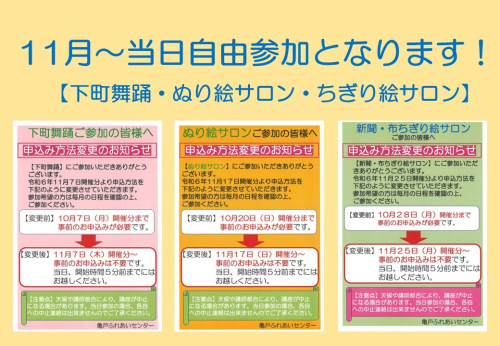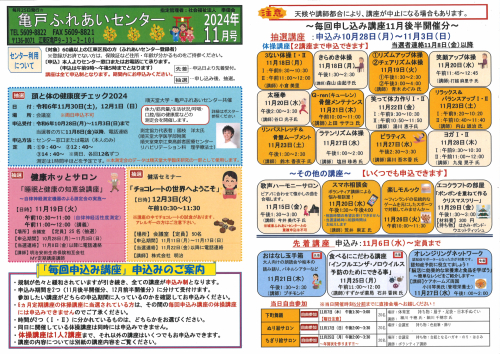 2024.10.31 祝!ドリかめ手帳300回達成!! 活動報告 2024.10.29 のびのび体操 はじまりました~(*^▽^*) 活動報告 2024.10.27 11月自由参加【ゆうゆう体操、カラオケ自由開放、卓球自由開放】日程表 お知らせ 2024.10.26 亀戸にこにこ秋祭りを開催しました♪ 活動報告 2024.10.25 明日に向けて準備中~ 活動報告 2024.10.25 2024年亀戸ふれあいセンター11月号予定表 お知らせ 2024.10.25 2024年亀戸ふれあいセンター11月号おたより お知らせ 2024.10.24 11月前半開催毎回申込講座 追加募集のご案内 お知らせ 2024.10.24 11月前半開催毎回申込講座 当選連絡その2【その他の講座】 お知らせ 2024.10.24 11月前半開催毎回申込講座 当選連絡その1【体操講座】 お知らせ 2024.10.21 祝!ドリかめ手帳スタンプ600個達成~!! 活動報告 2024.10.18 有明医療大学看護学生さんいらっしゃ~い① 活動報告 2024.10.18 自悠大学亀戸クラス ~9月開催分のご報告~ 活動報告 2024.10.16 一部講座(下町舞踊、ぬり絵サロン、ちぎり絵サロン)の申込方法変更のお知らせ お知らせ 2024.10.16 おいしいね♫ふれあい食堂 活動報告 1 … 19 20 21 22 23 … 44