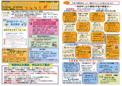 2024.09.10 令和6年度秋の定期講座追加募集のご案内 お知らせ 2024.09.10 令和6年度秋の定期講座(10月~3月)の当選連絡をお知らせします お知らせ 2024.09.09 楽しい時間・・ふれあい食堂♬ 活動報告 2024.09.09 より親しみを感じました!【健活セミナー チーズを知りチーズに親しむ】 活動報告 2024.09.06 9月後半開催毎回申込講座 追加募集のご案内 お知らせ 2024.09.06 9月後半開催毎回申込講座 当選連絡その2【その他の講座】 お知らせ 2024.09.06 9月後半開催毎回申込講座 当選連絡その1【体操講座】 お知らせ 2024.09.04 自悠大学入学式&合同講座を行いました! 活動報告 2024.09.04 祝!ドリかめ手帳スタンプ600個達成!! 活動報告 2024.08.31 【お知らせ】令和6年度コーラス前期ご参加の皆様へ お知らせ 2024.08.29 素敵なうちわが出来上がりました♬ 活動報告 2024.08.26 朝活盆踊り ~レッツ!ダンシング~ 活動報告 2024.08.24 9月自由参加【ゆうゆう体操、カラオケ自由開放、卓球自由開放】日程表 お知らせ 2024.08.24 2024亀戸ふれあいセンター9月号予定表 お知らせ 2024.08.24 2024年亀戸ふれあいセンター9月号おたより お知らせ 1 … 22 23 24 25 26 … 44