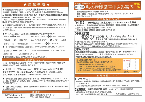 2024.08.08 10月開講 【令和6年度秋の定期講座申込み案内】のお知らせ お知らせ 2024.08.08 8月後半毎回申込講座 追加募集のご案内 お知らせ 2024.08.07 かわいい小物サロン ~貝殻が大変身~ 活動報告 2024.08.07 第2期3ヶ月講座【歌唱力アップボイストレーニング】始まりました♪ 活動報告 2024.08.06 8月卓球開放日一部変更のお知らせ お知らせ 2024.08.05 祝!ドリかめ手帳スタンプ200個達成! 活動報告 2024.08.05 いっぱい遊んだね!ふれあい食堂~ 活動報告 2024.08.01 世界に一つのうちわ作り 募集しま~す♪ お知らせ 2024.08.01 暑さに負けず盛り上がりました! 【亀戸パラダイスキング】 活動報告 2024.07.30 祝!ドリかめ手帳スタンプ400個達成! 活動報告 2024.07.29 【2024夏の新規登録スペシャルキャンペーン】が始まります!! お知らせ 2024.07.29 夏に向けて元気に咲こう! ひまわりの花 【折り紙サロン】 活動報告 2024.07.26 定期講座(書道) 活動報告 2024.07.25 8月自由参加【ゆうゆう体操、カラオケ自由開放、卓球自由開放】日程表 お知らせ 2024.07.25 2024亀戸ふれあいセンター8月号予定表 お知らせ 1 … 24 25 26 27 28 … 44