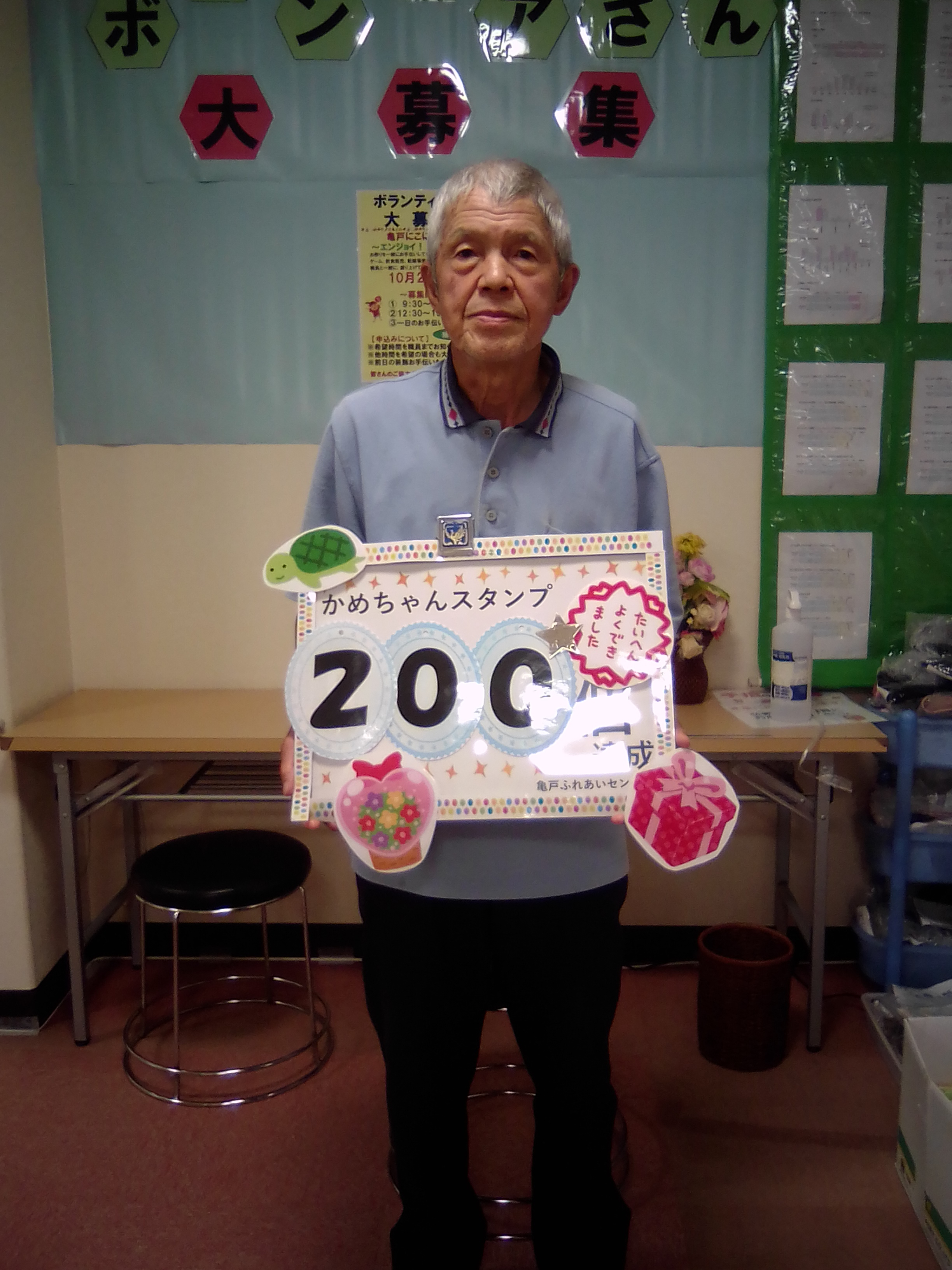 亀戸ふれあいセンター来館時のお楽しみかめちゃんスタンプ200個達成されましたH.M様です。
