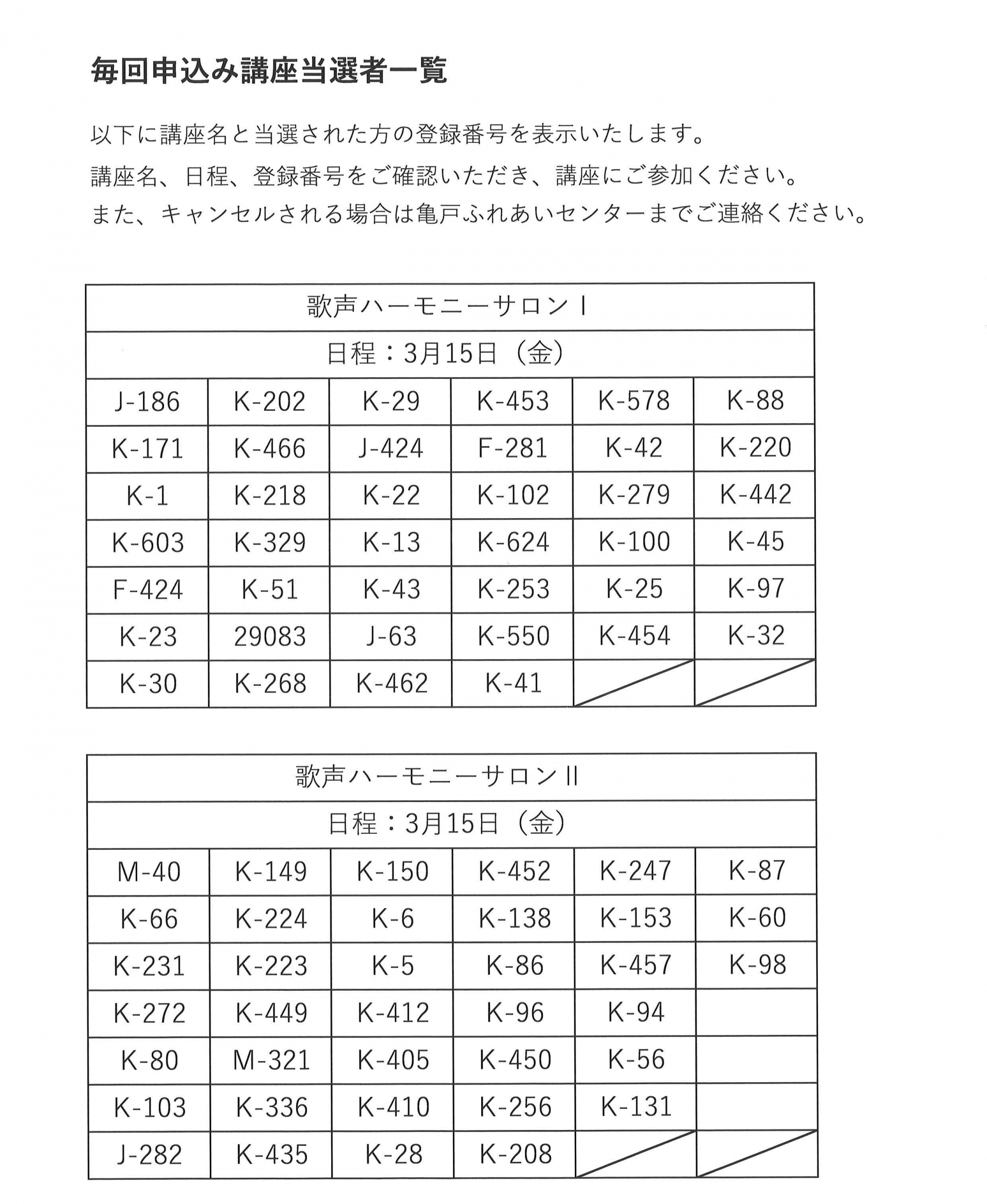 3月後半開催の毎回申込み講座の当選発表をいたします。