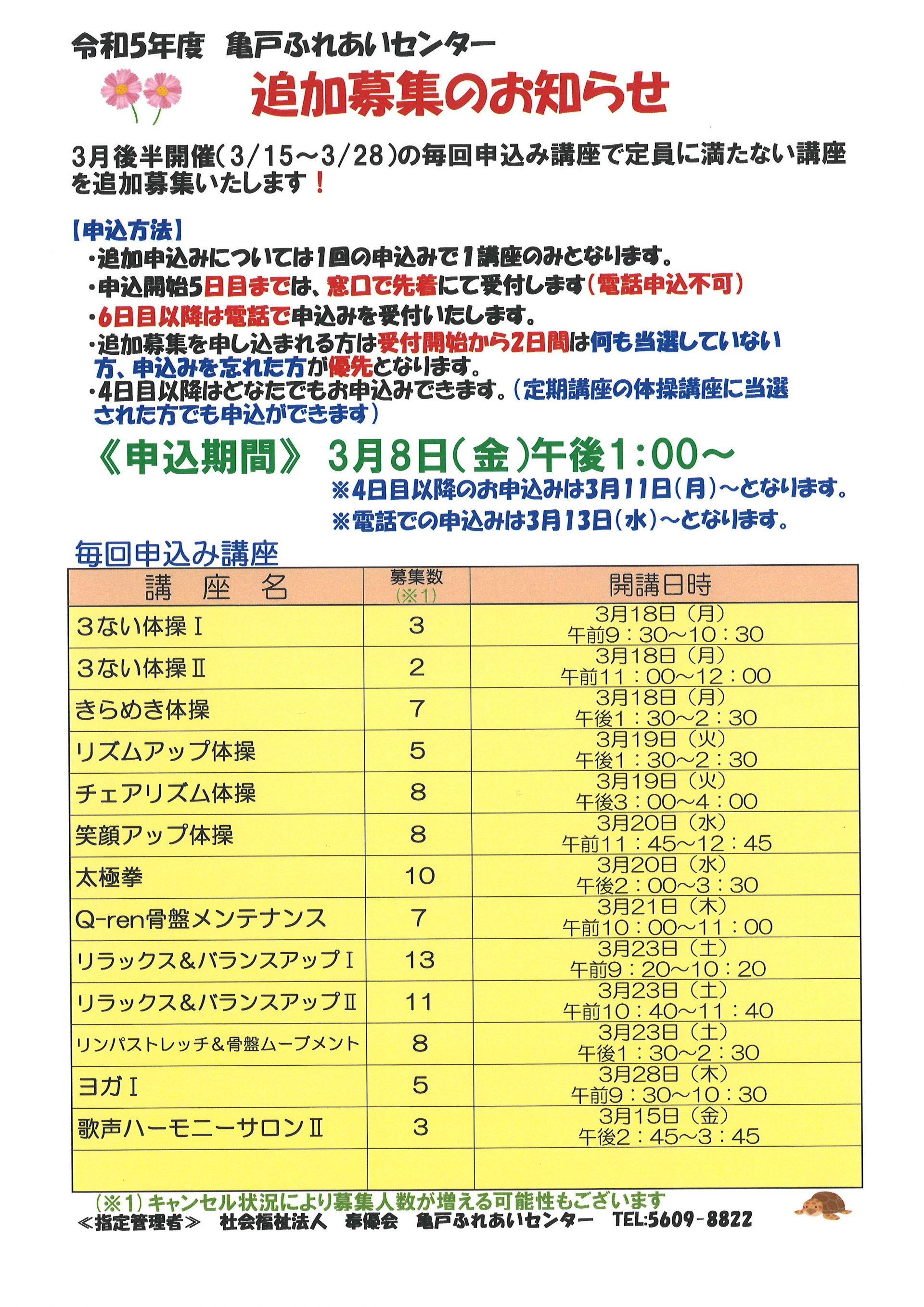 3月前半開催の毎回申込講座で定員に満たなかった講座の追加募集を行います。追加募集する講座は以下の講座となります。