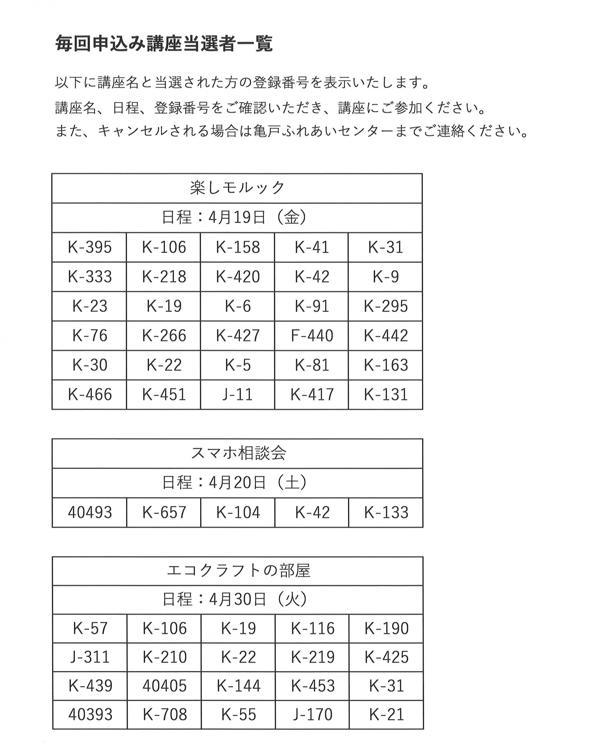 4月後半開催の毎回申込み講座および3ヶ月講座の当選発表をいたします。