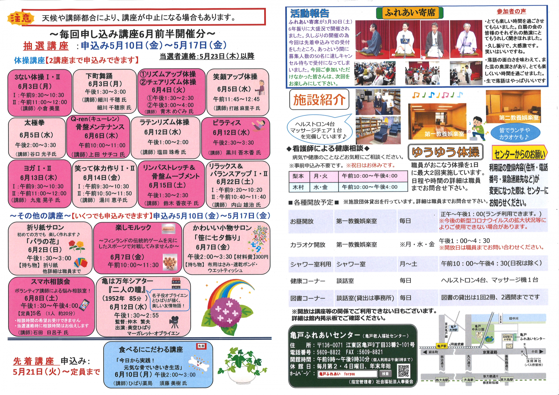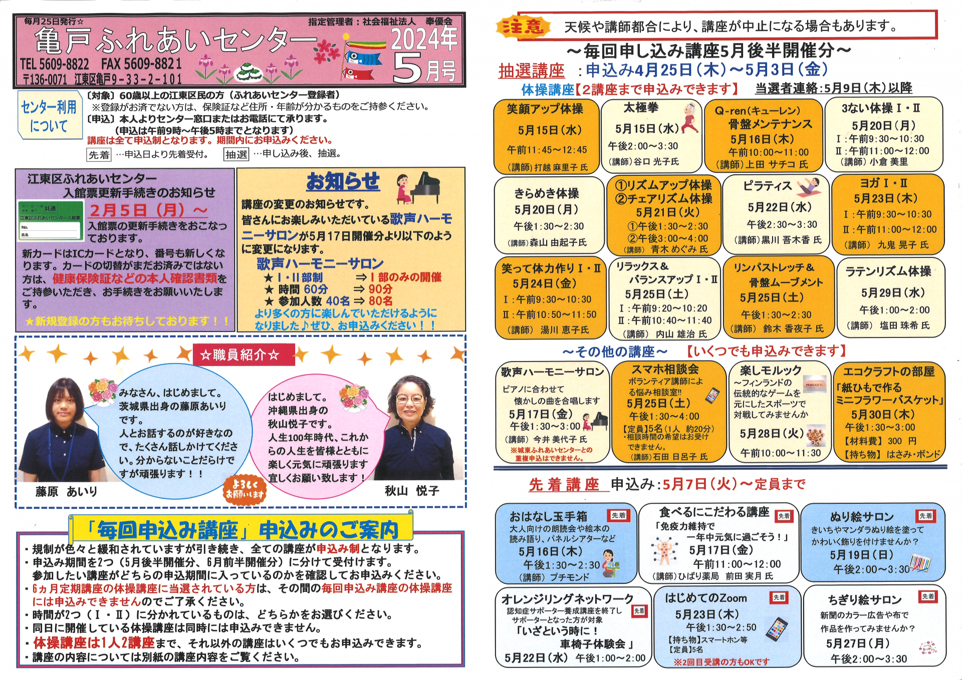 2024.04.25 お知らせ 2024亀戸ふれあいセンター5月号おたより Tweet シェアする 2024亀戸ふれあいセンター5月号おたより完成しました。 前の記事 2024.04.25 お知らせ 5月自由参加【ゆうゆう体操、カラオケ自由開放、卓球自由開放】日程表 次の記事 2024.04.25 お知らせ 2024亀戸ふれあいセンター5月号予定表 一覧へ戻る