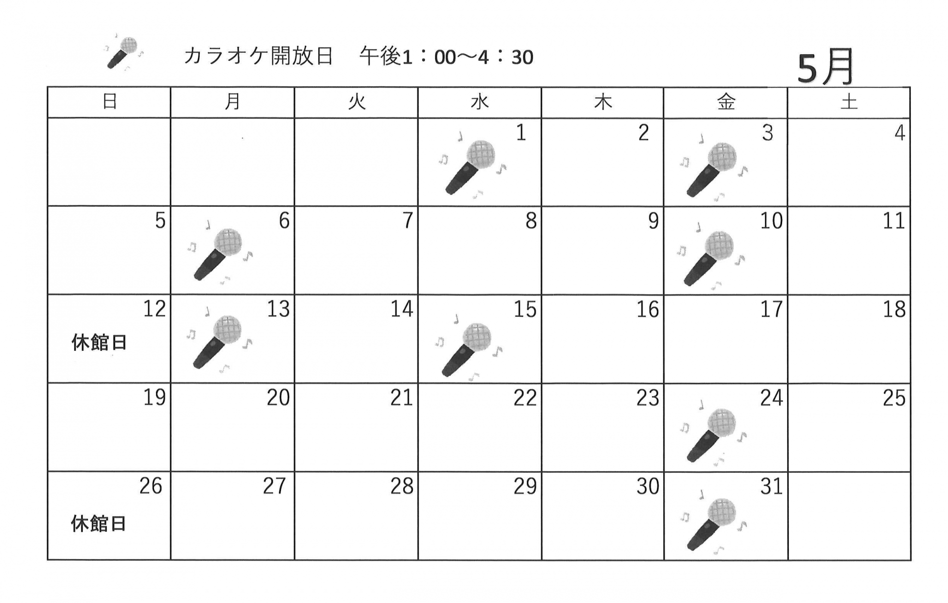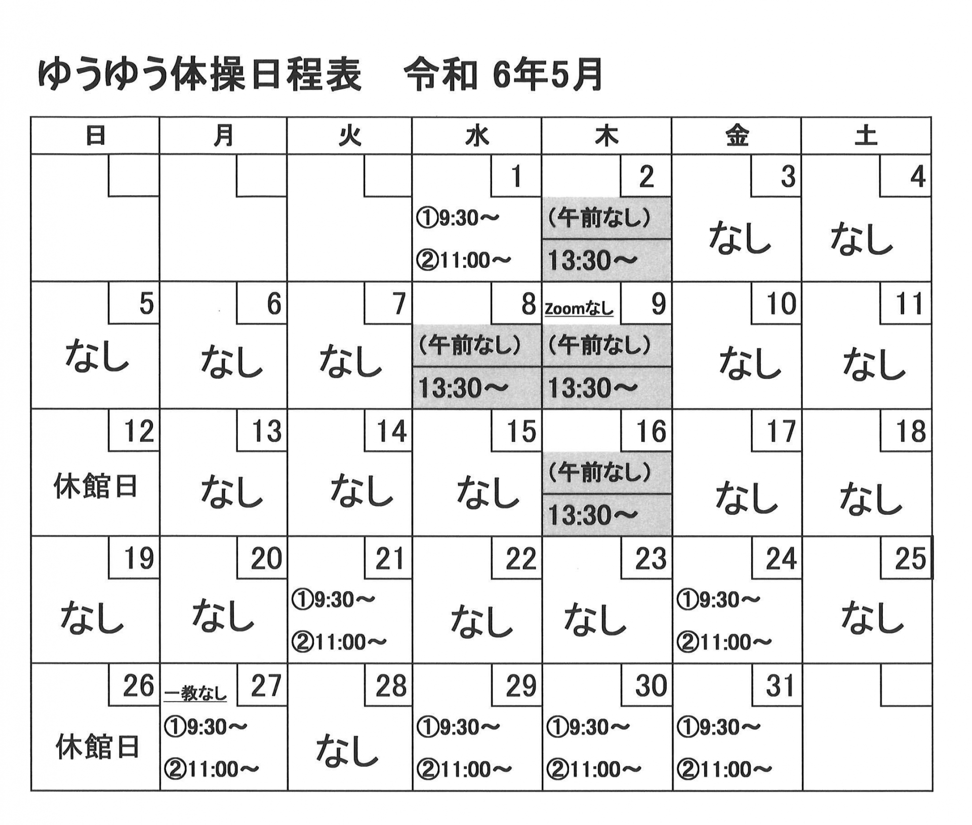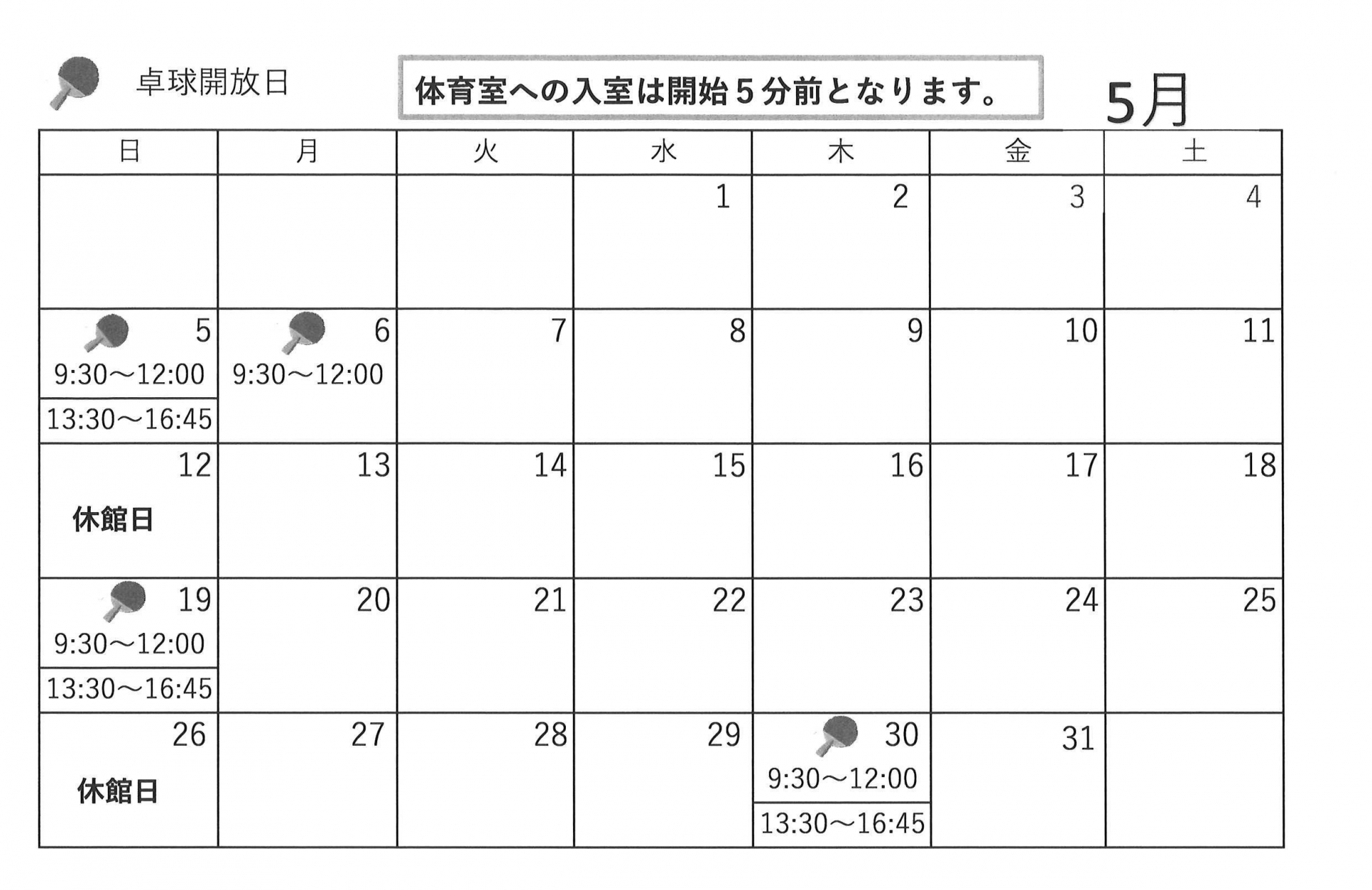 5月開催【ゆうゆう体操、カラオケ自由開放、卓球自由開放】日程表のお知らせです。