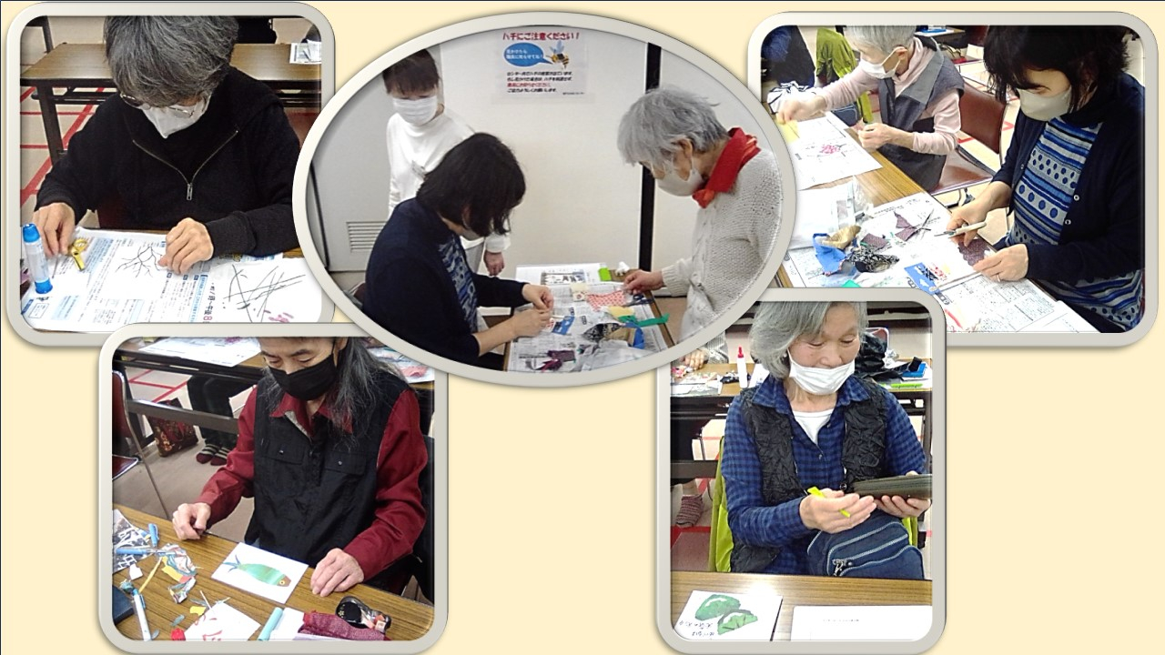 5月のイベント、鯉のぼり・兜・母の日・柏餅・5月のお花などそれぞれの作品に素敵な一言が添えられて華やかなちぎり絵になりました。今回も初めての方にご参加いただきましたが、ボランティア講師のお二人や周りの方からアドバイスをうけながら、かわいい鯉のぼりのちぎり絵が出来上がりました。