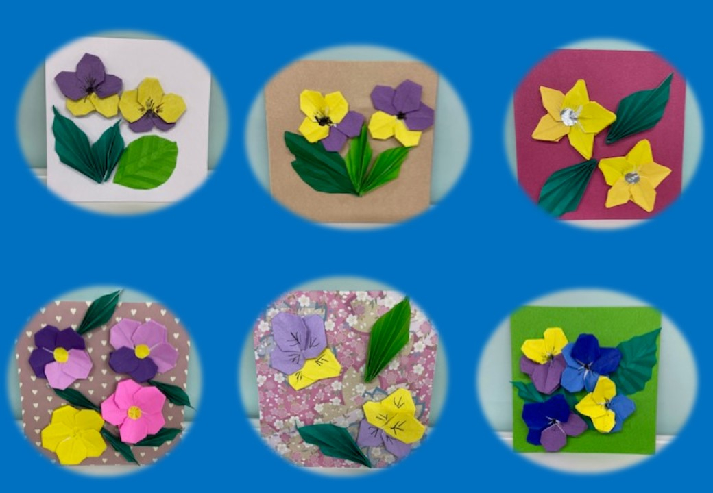 今回のパンジーもカラフルに紫や黄色、オレンジなどの折り紙を使い作っていただきました。