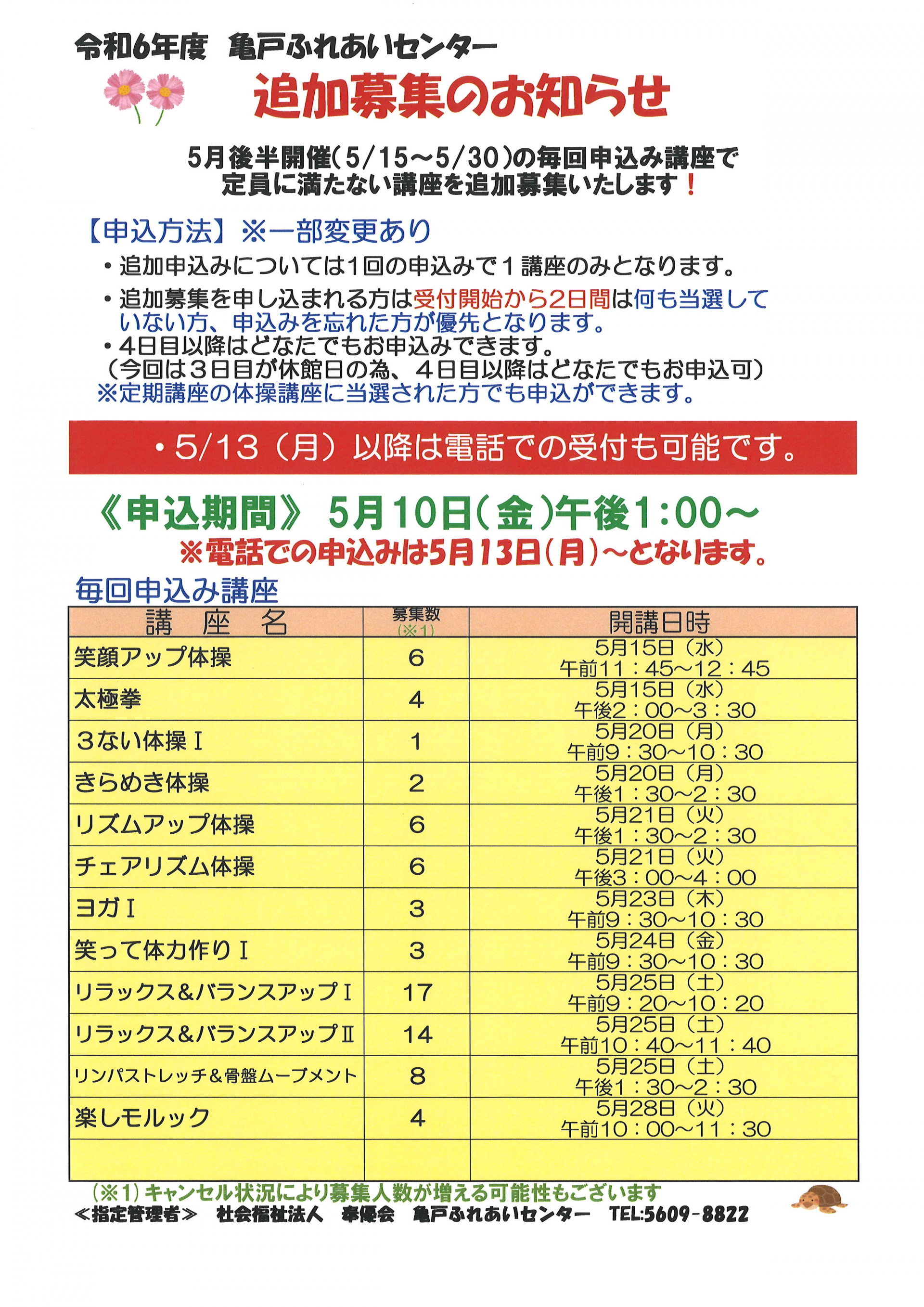 5月後半開催の毎回申込講座で定員に満たなかった講座の追加募集を行います。追加募集する講座は以下の講座となります。