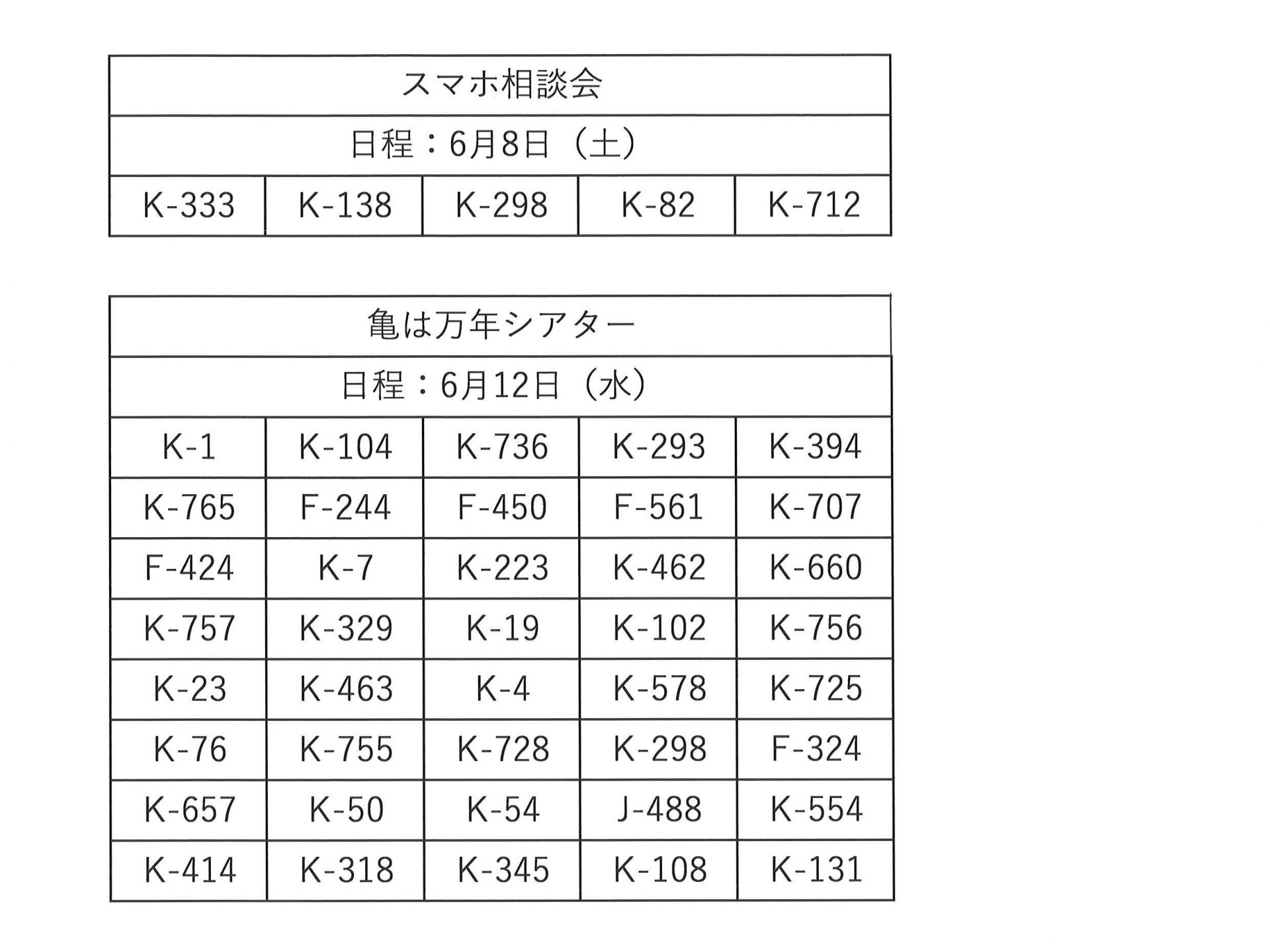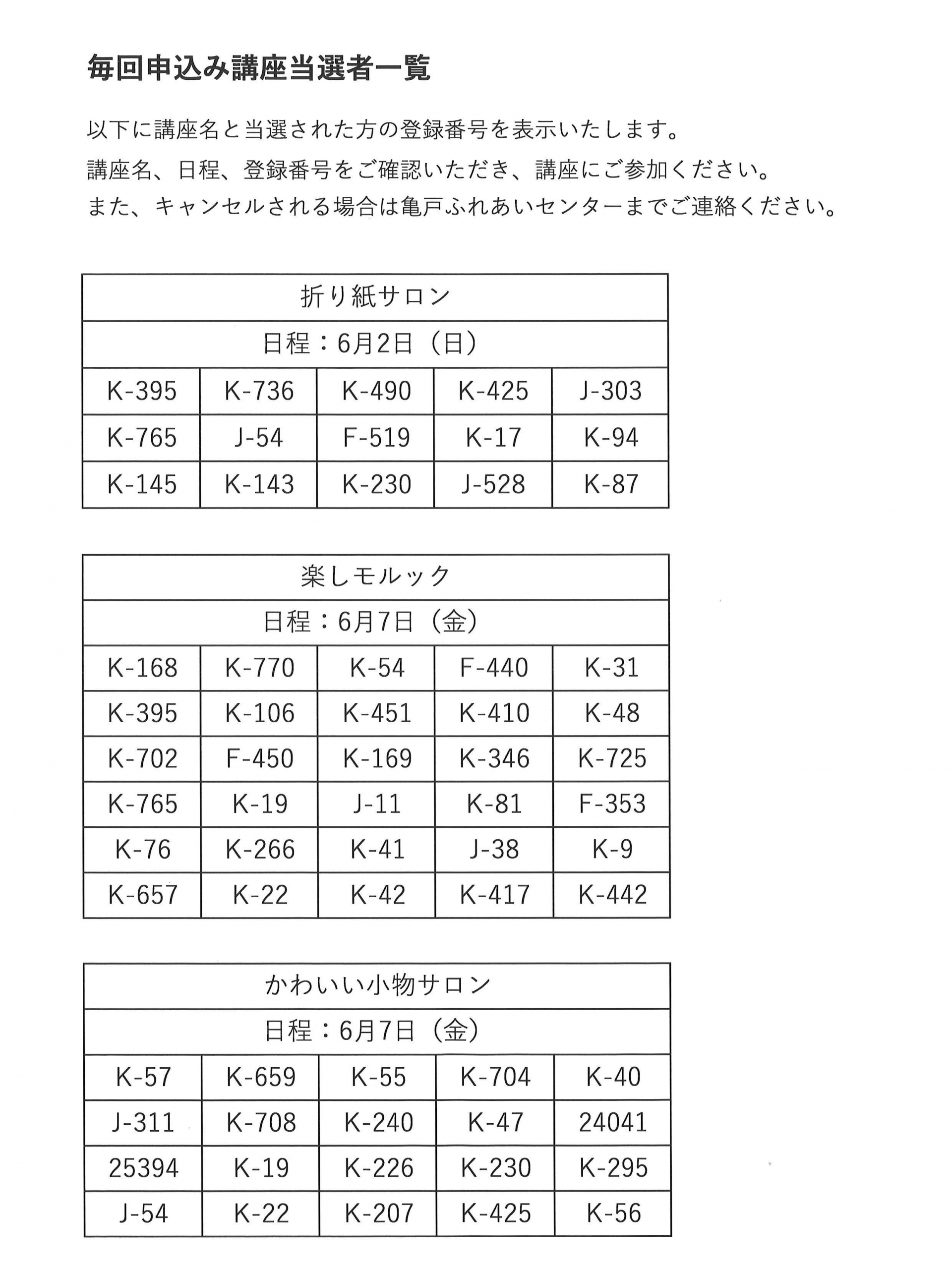6月前半開催の毎回申込み講座の当選発表をいたします。