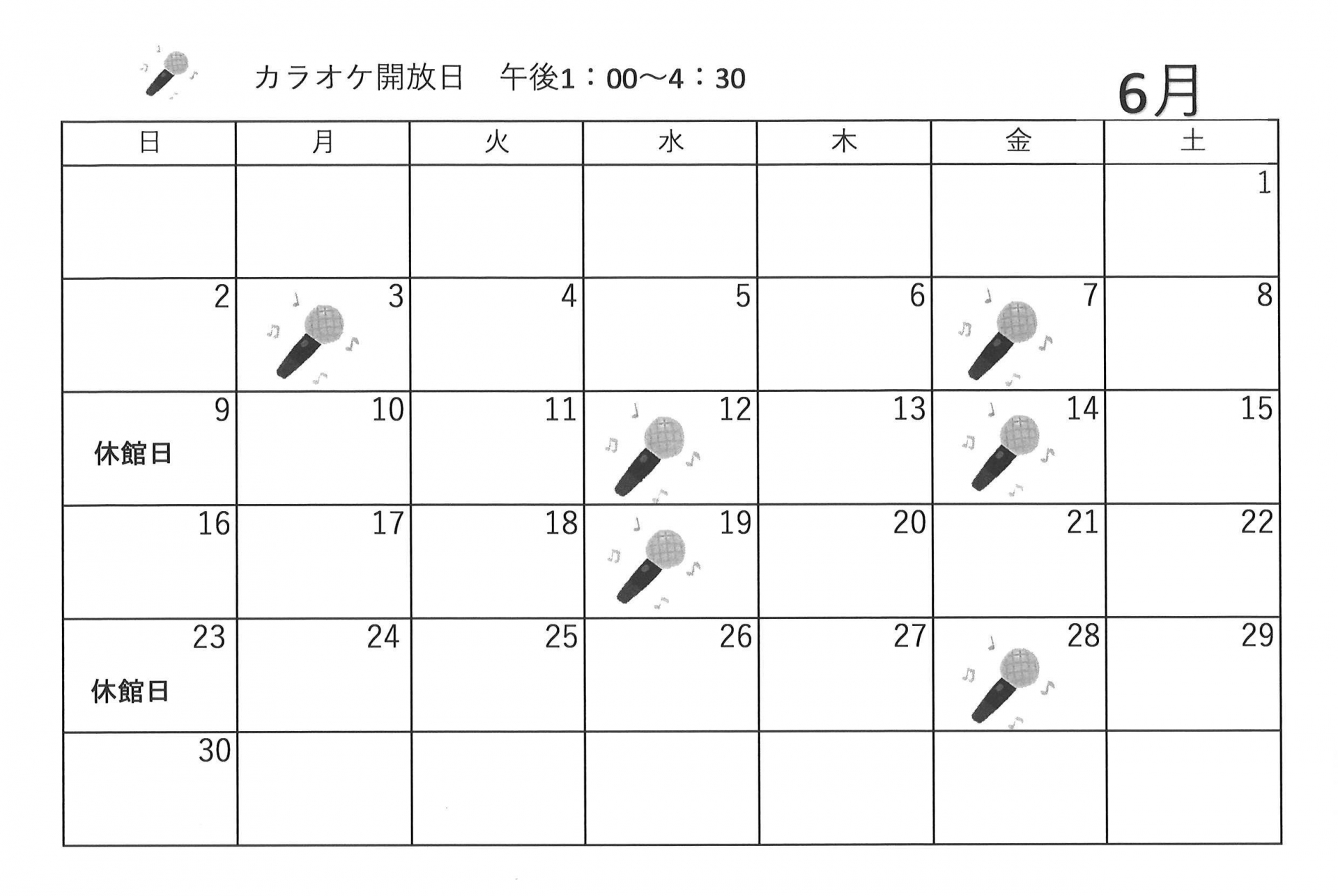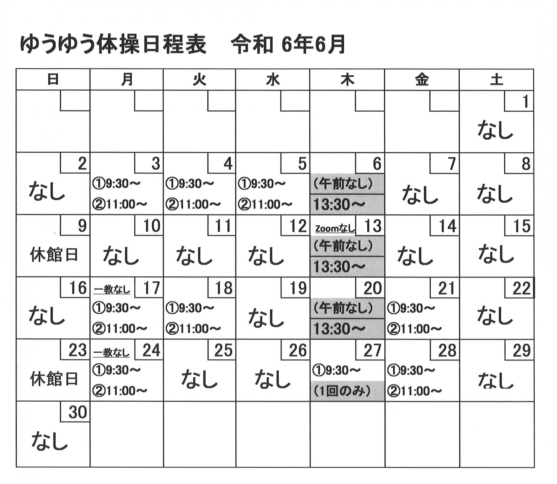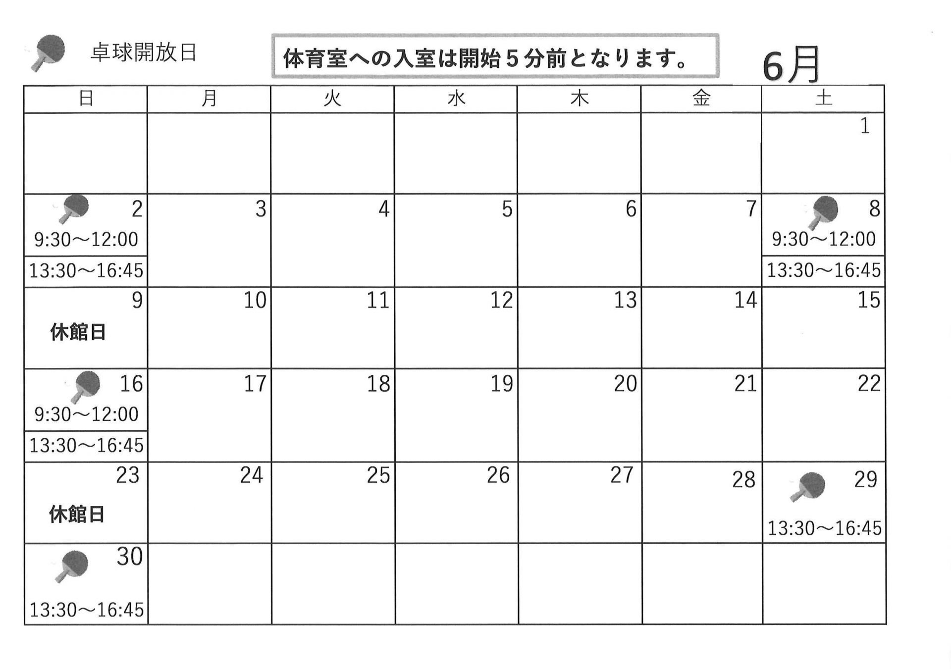 6月自由参加【ゆうゆう体操、カラオケ自由開放、卓球自由開放】日程表