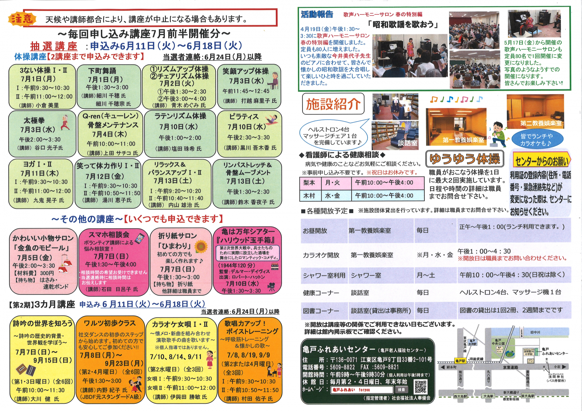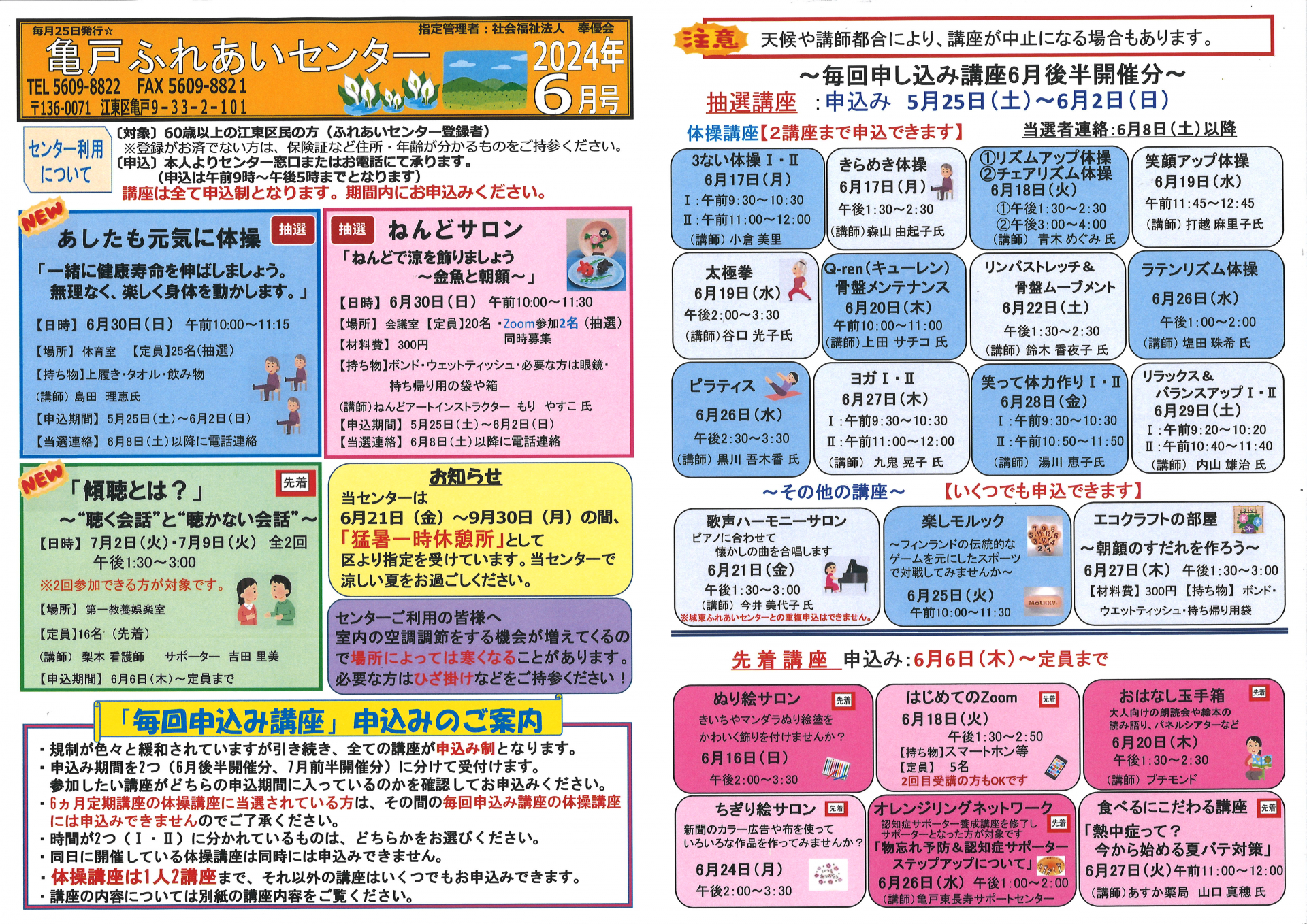 2024.05.25 お知らせ 2024亀戸ふれあいセンター6月号おたより Tweet シェアする 2024年亀戸ふれあいセンター6月号おたより完成しました。 前の記事 2024.05.25 お知らせ 2024亀戸ふれあいセンター6月号予定表 次の記事 2024.05.25 お知らせ 6月自由参加【ゆうゆう体操、カラオケ自由開放、卓球自由開放】日程表 一覧へ戻る