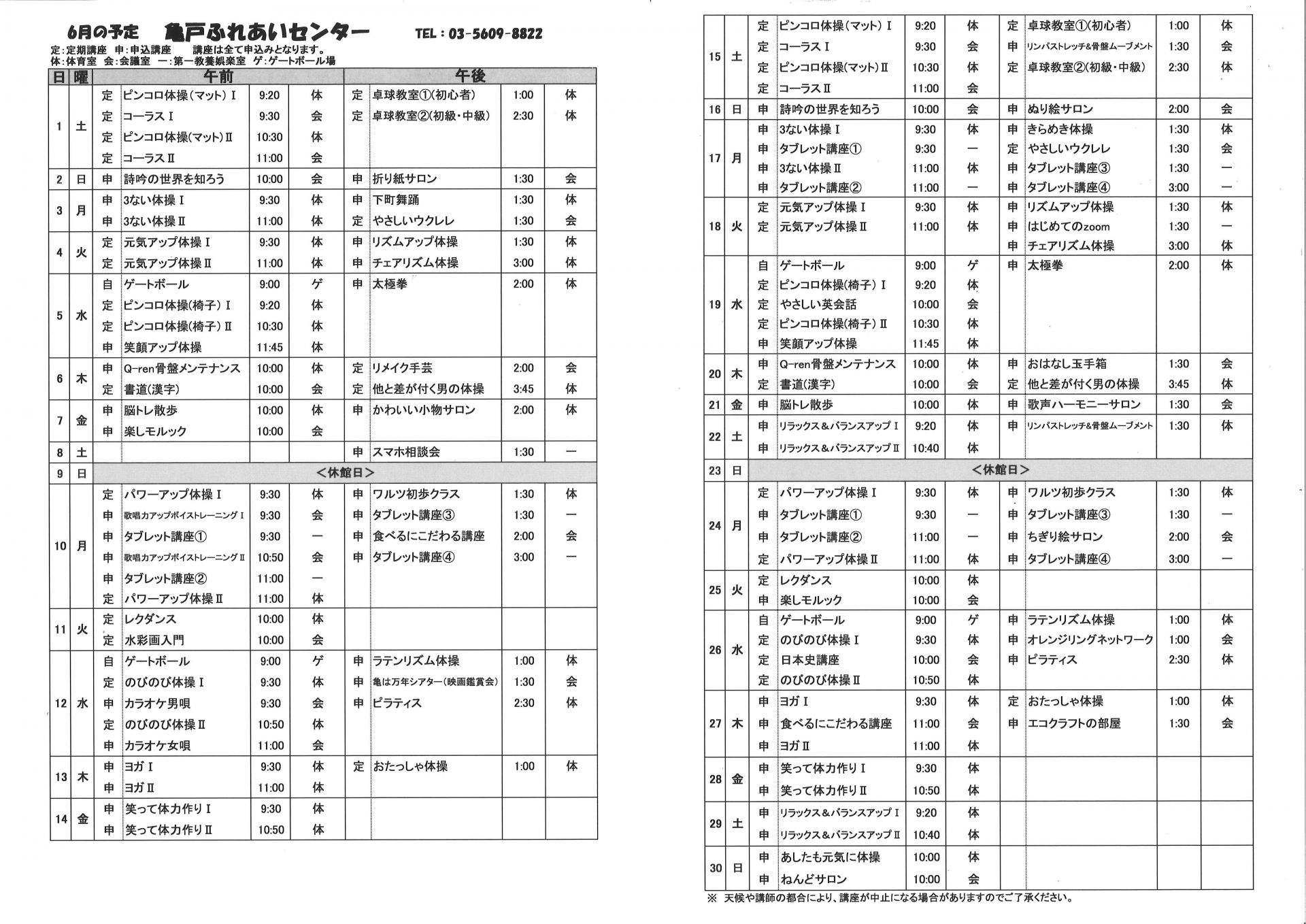 2024.05.25 お知らせ 2024亀戸ふれあいセンター6月号予定表 Tweet シェアする 2024亀戸ふれあいセンター6月号予定表、完成しました。 前の記事 2024.05.27 お知らせ 【再掲】6月前半開催毎回申込講座 当選者連絡その1【体操講座】 次の記事 2024.05.25 お知らせ 2024亀戸ふれあいセンター6月号おたより 一覧へ戻る