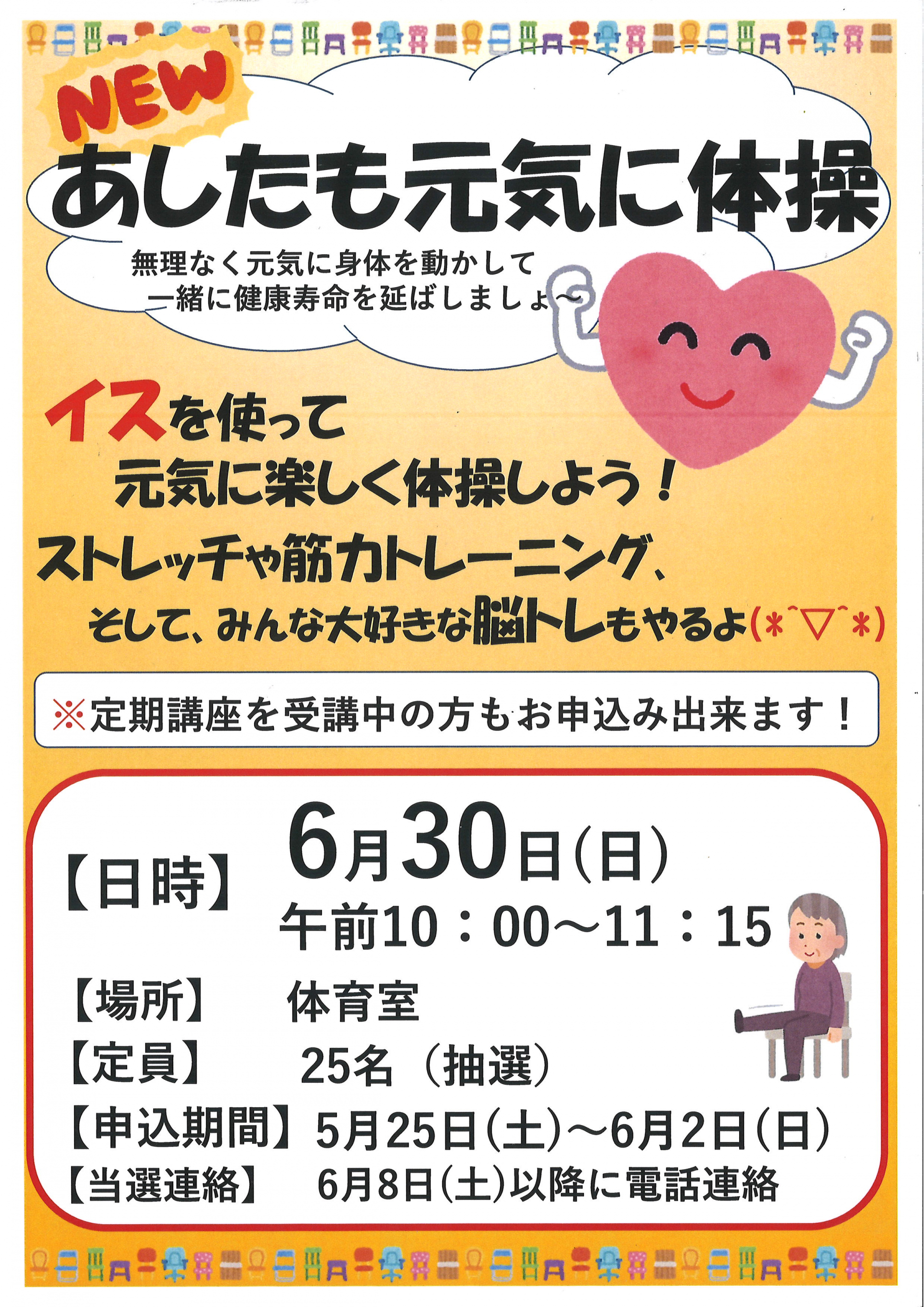 定期体操講座にご参加いただいているみなさんも、この体操はお申込みいただけますので、興味がある方は6月2日(日)17:00までに忘れずにお申込みください。