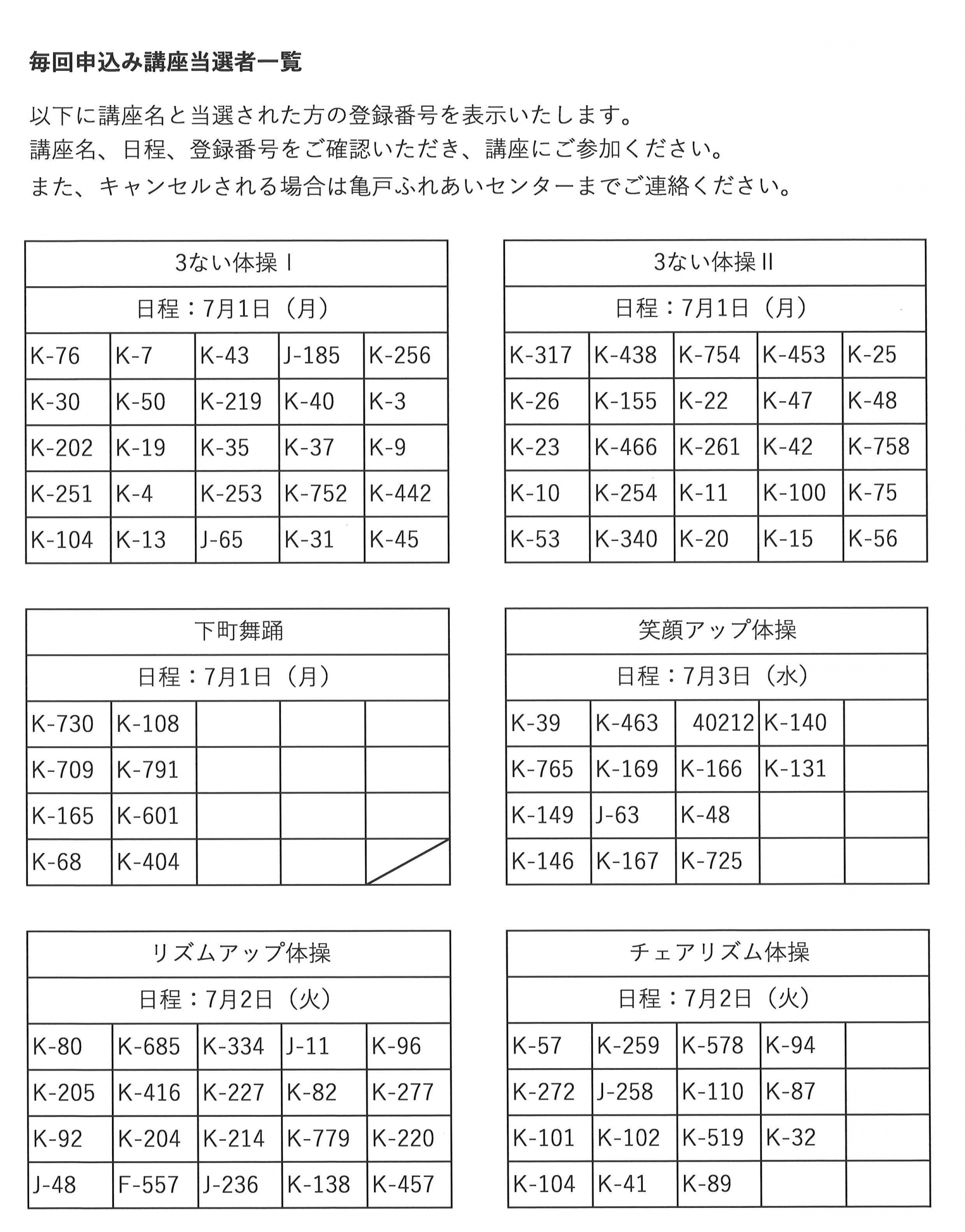 7月前半開催の毎回申込み講座の当選発表をいたします。