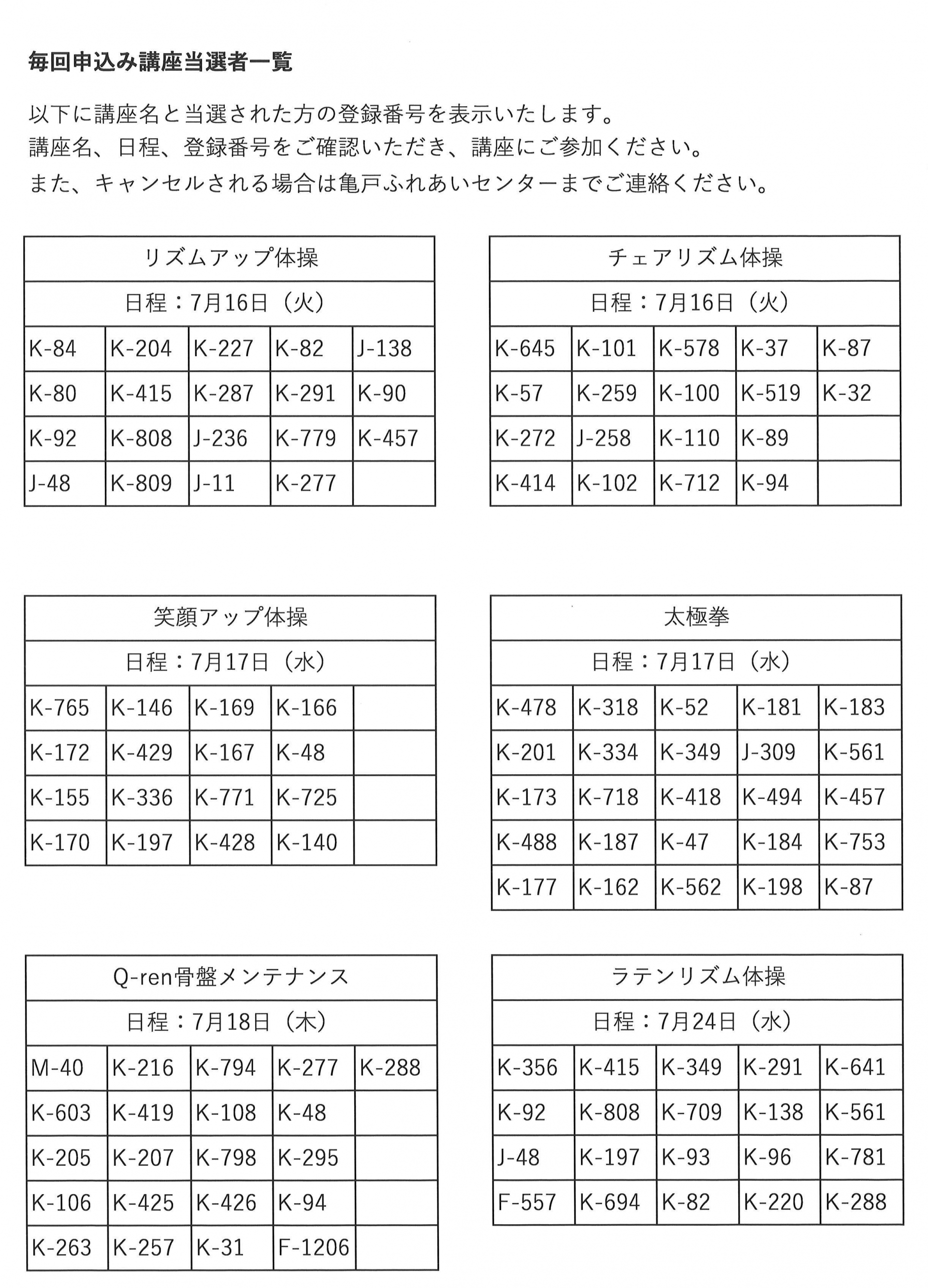 7月後半開催の毎回申込み講座の当選発表をいたします。