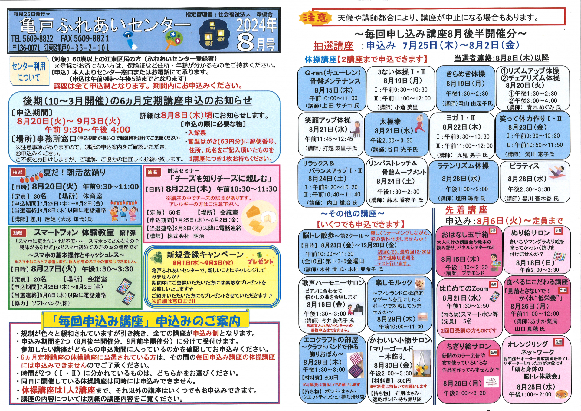 2024.07.25 お知らせ 2024年亀戸ふれあいセンター8月号おたより Tweet シェアする 2024年亀戸ふれあいセンター8月号おたより完成しました。 前の記事 2024.07.25 お知らせ 2024亀戸ふれあいセンター8月号予定表 次の記事 2024.07.24 お知らせ 令和6年度自悠大学の抽選結果のハガキを投函しました 一覧へ戻る
