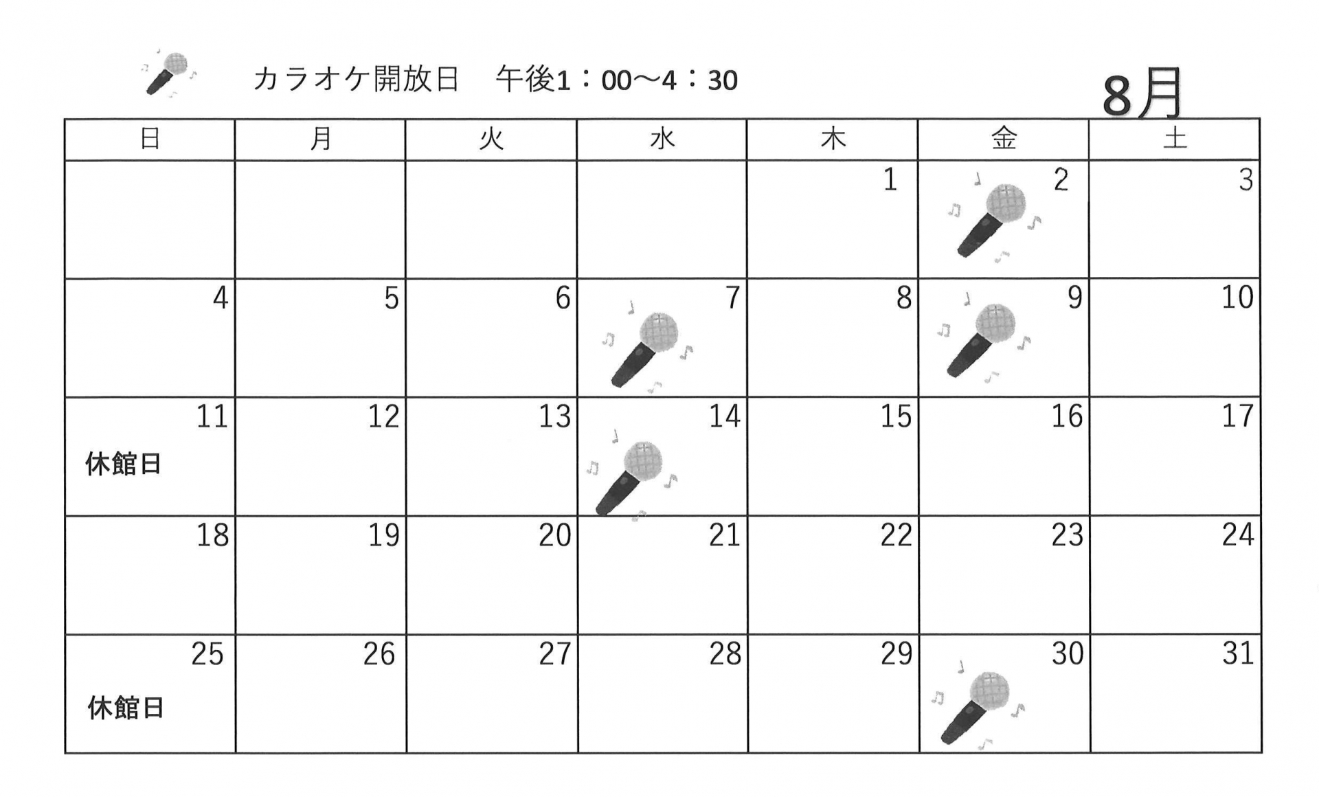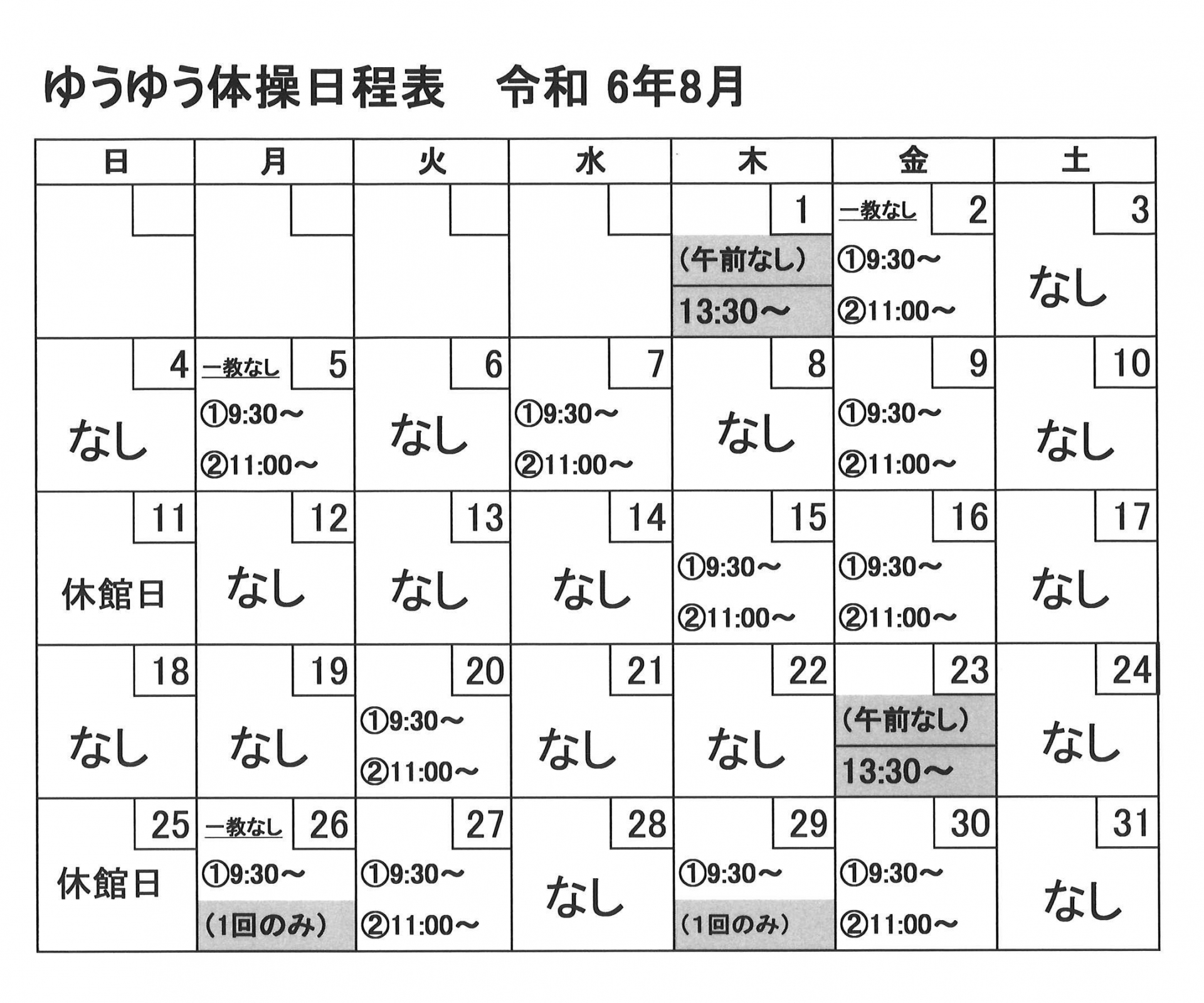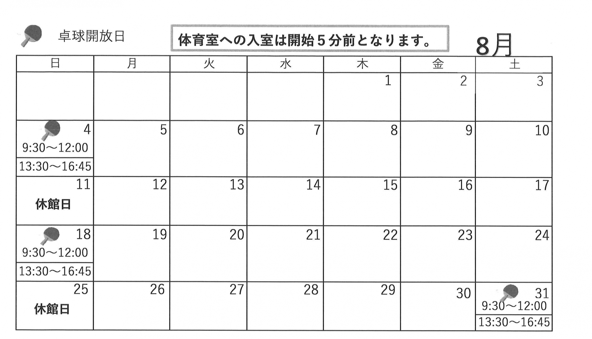 8月開催【ゆうゆう体操、カラオケ自由開放、卓球自由開放】日程表のお知らせです。