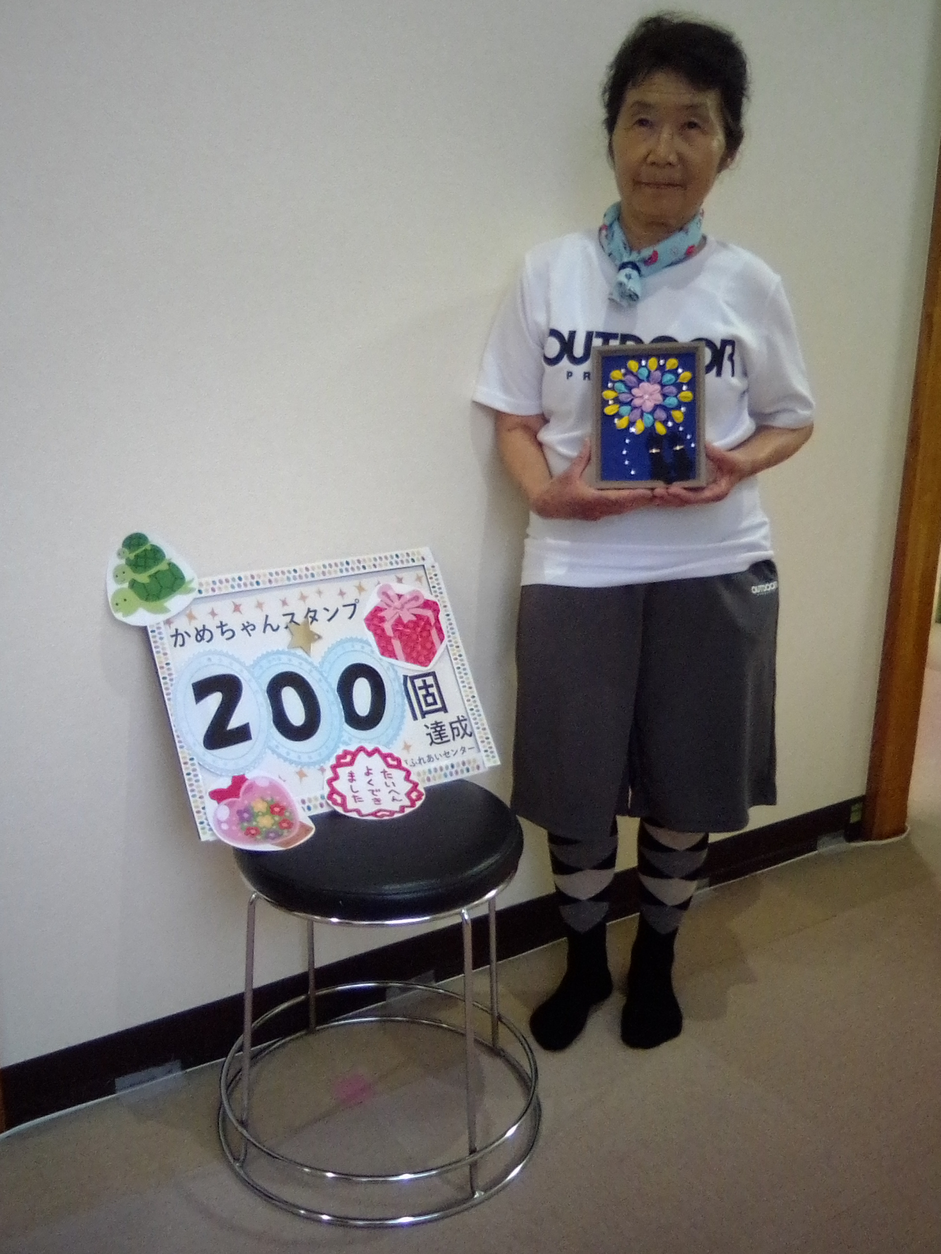 K.Y様は、定期講座コーラス、元気アップ体操の他、折り紙サロンやエコクラフトの部屋など、教養講座、体操講座、手作り系の講座など多岐にわたり参加されています。スタンプをコツコツとため、やっと200個を達成し、とてもかわいらしい笑顔で喜んでくださいました。