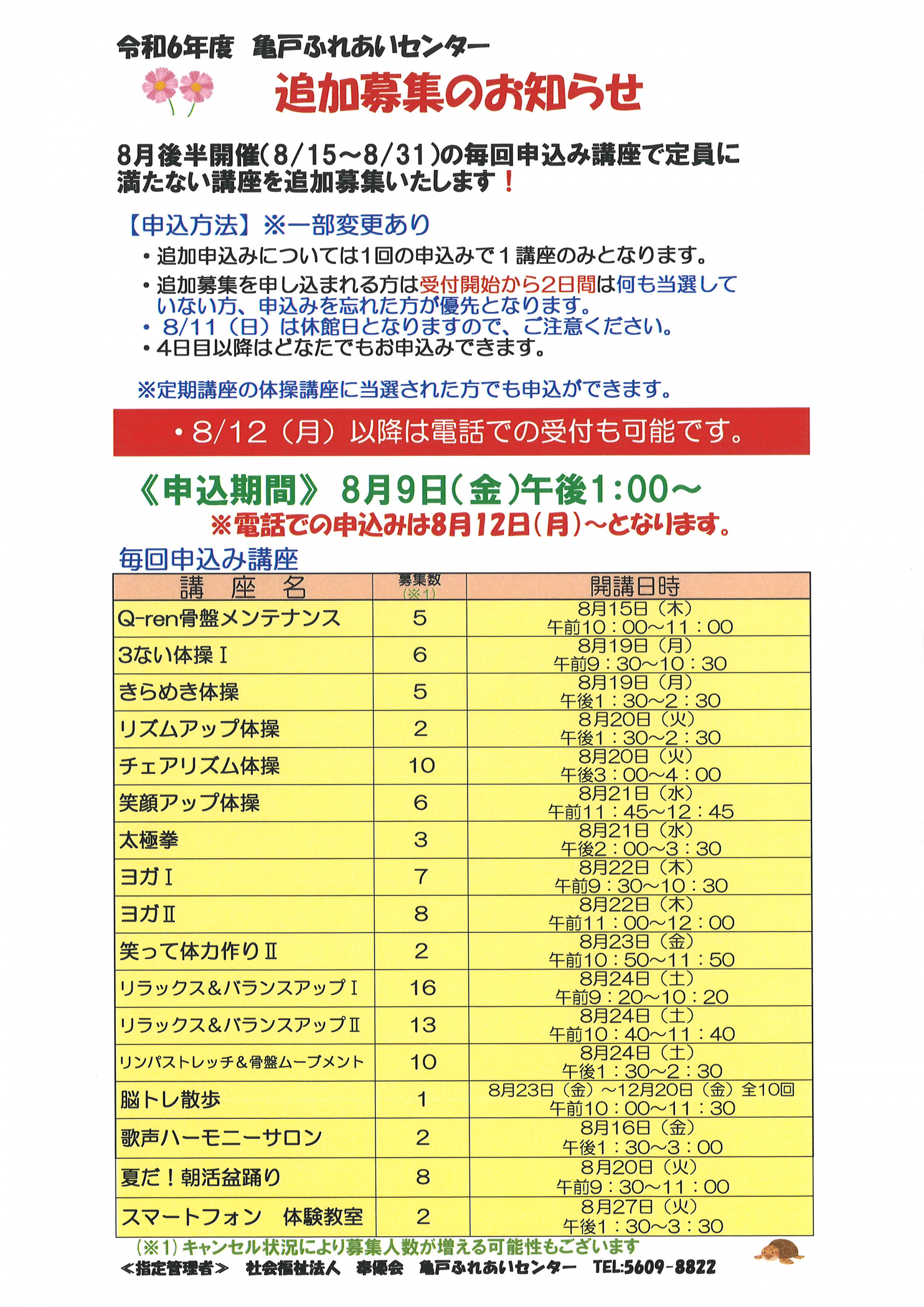 8月後半開催の毎回申込講座で定員に満たなかった講座の追加募集を行います。追加募集する講座は以下の講座となります。