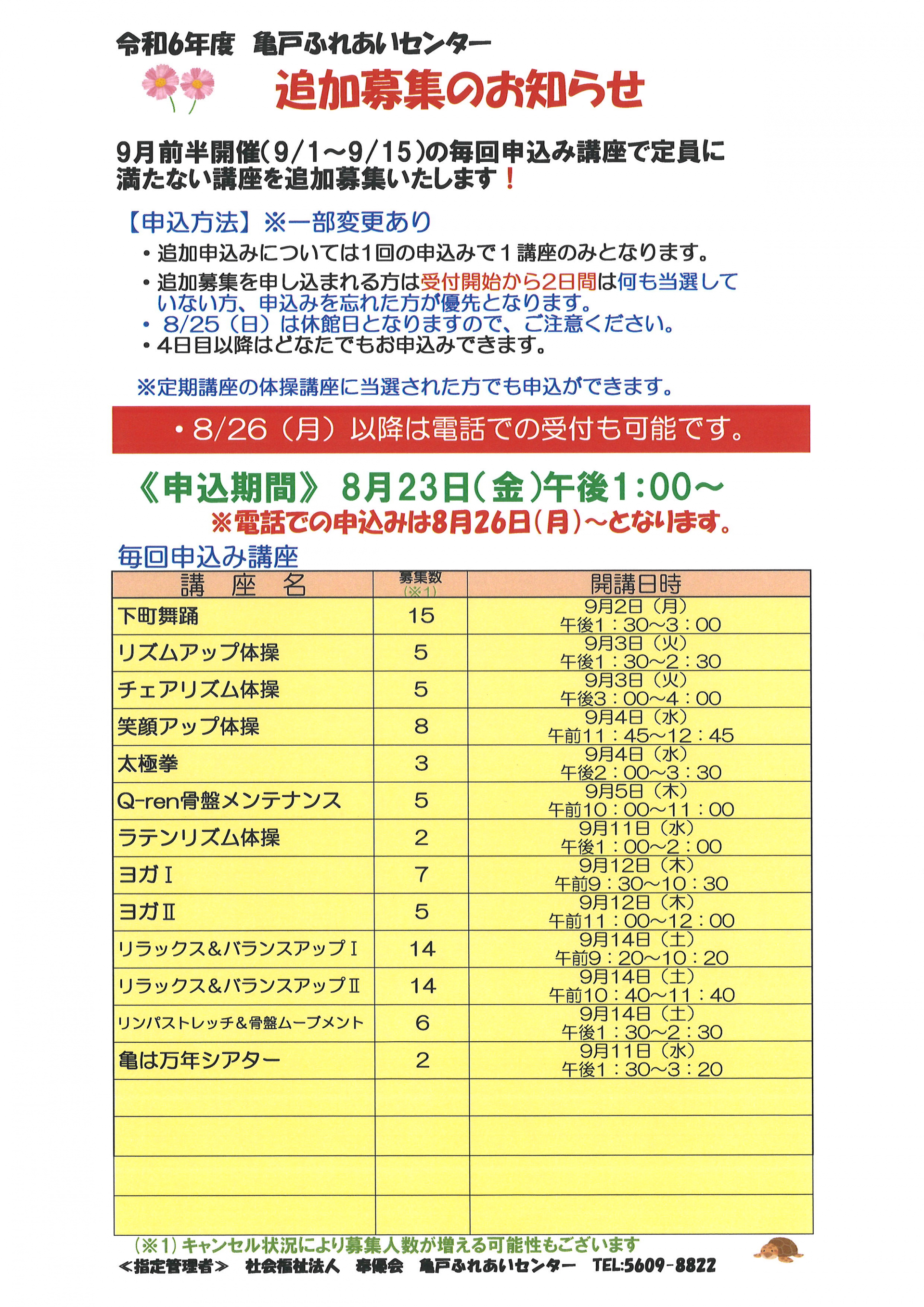 9月前半開催の毎回申込講座で定員に満たなかった講座の追加募集を行います。追加募集する講座は以下の講座となります。