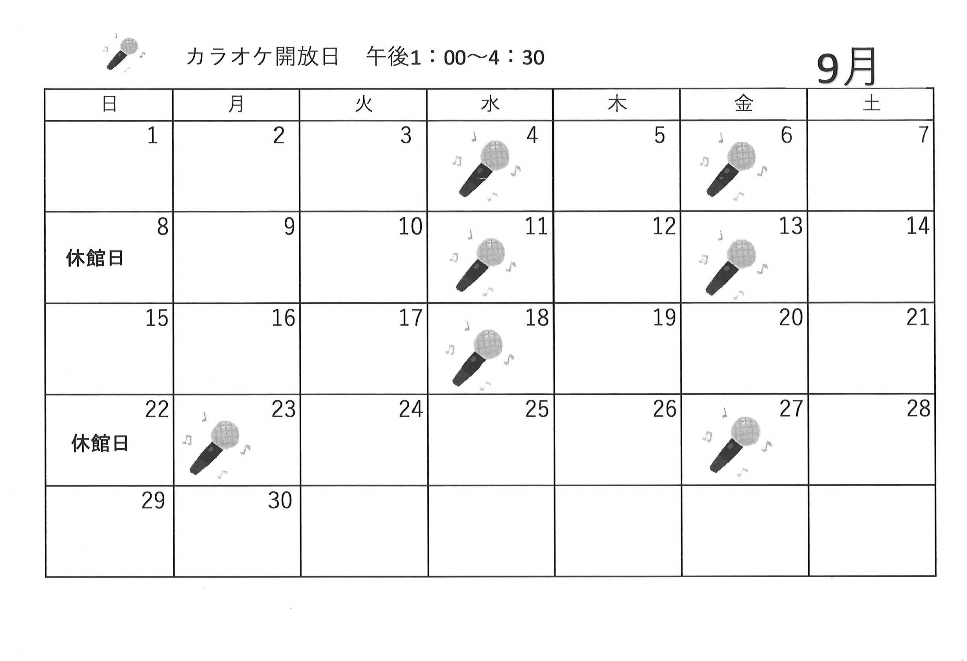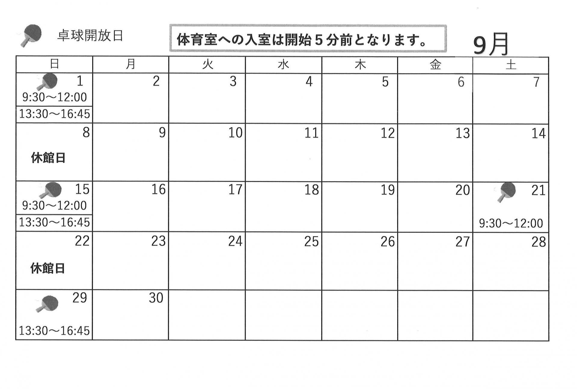 9月自由参加【ゆうゆう体操、カラオケ自由開放、卓球自由開放】日程表