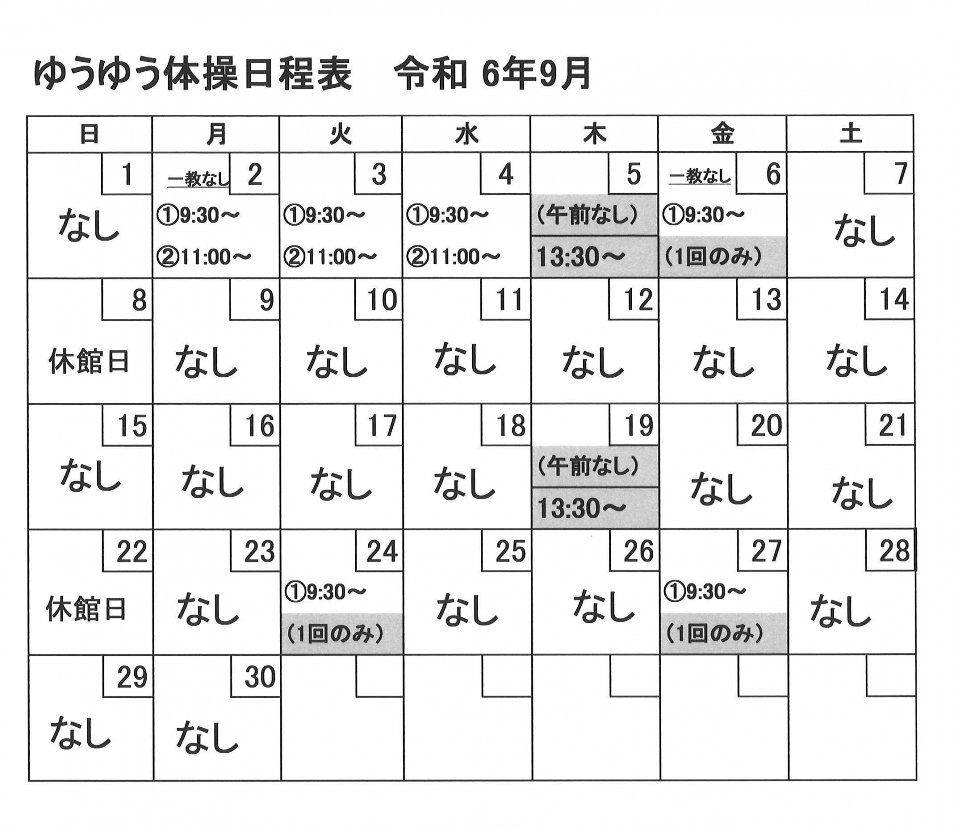 9月開催【ゆうゆう体操、カラオケ自由開放、卓球自由開放】日程表のお知らせです。
