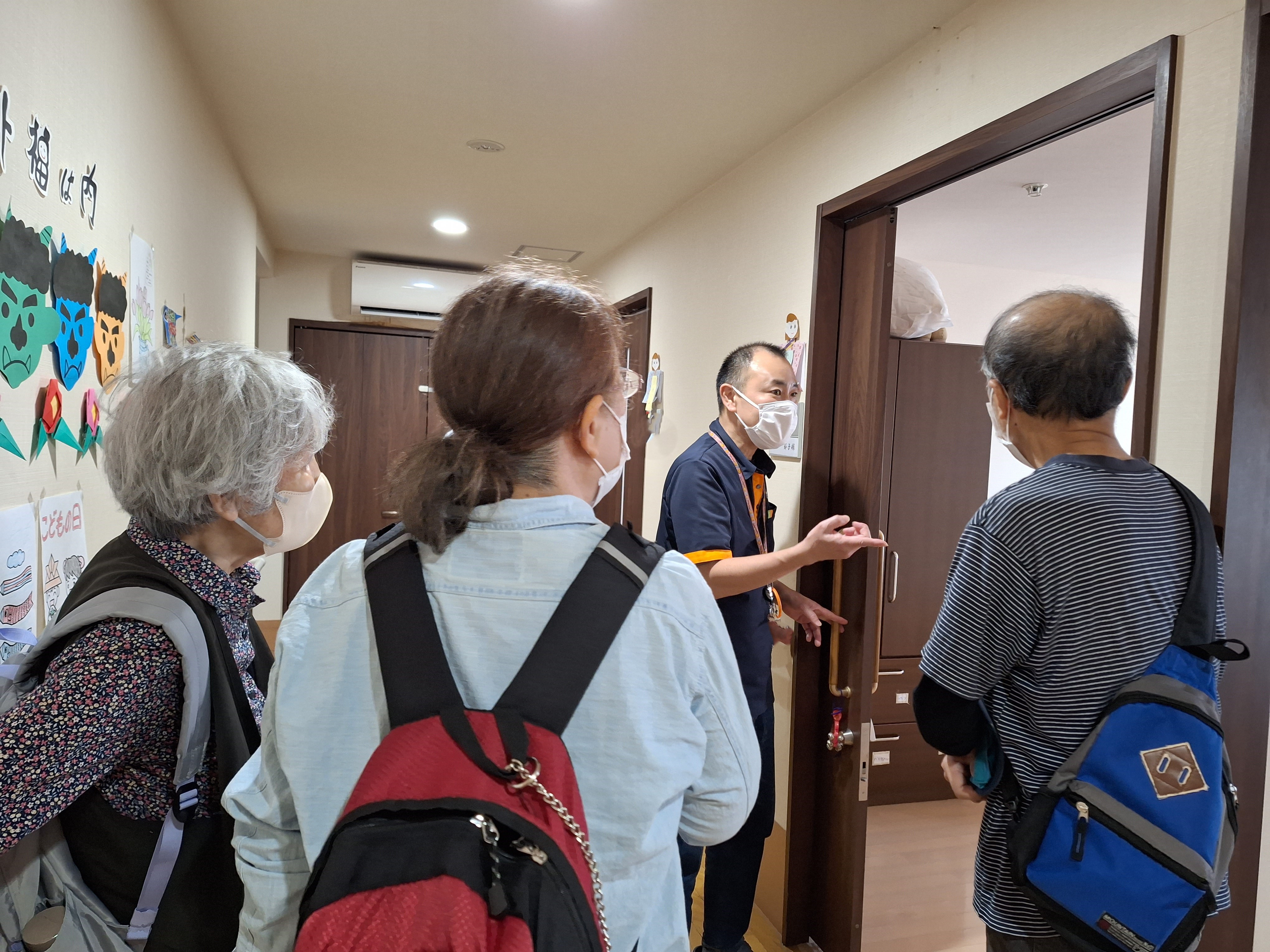 天神あやめさんでは、実際に入居している方のお部屋や共有スペースを回りながら説明を受けました。初めての見学で戸惑っている方もいらっしゃいましたが、入居者さんとお話させていただくなど、入居者さんの穏やかな日常を垣間見ることでほっこり和やかな雰囲気に。帰り際にはお互いに笑顔で手を振りながらお別れしました。