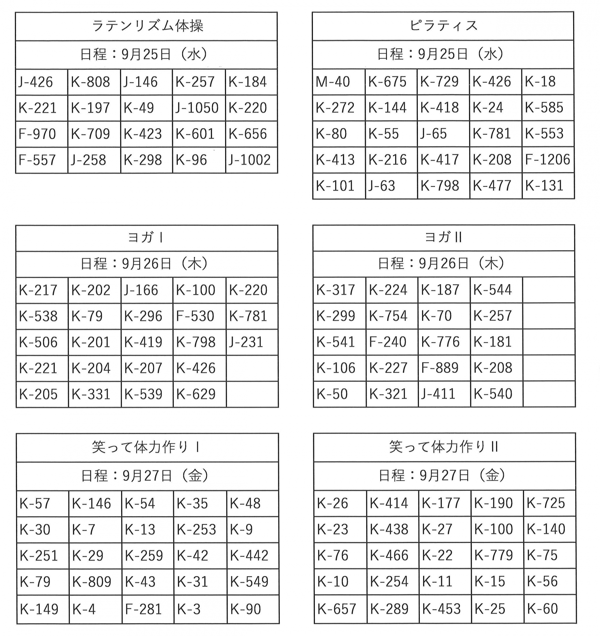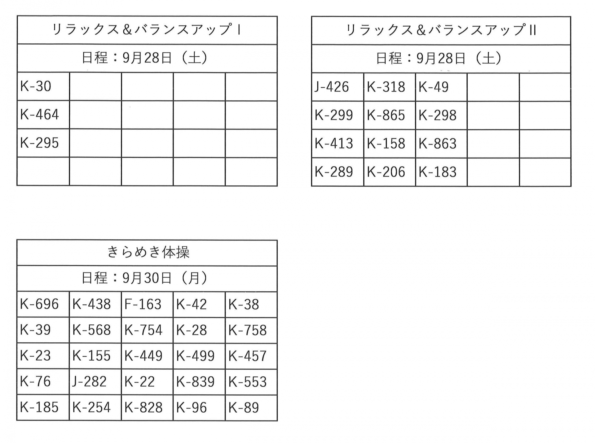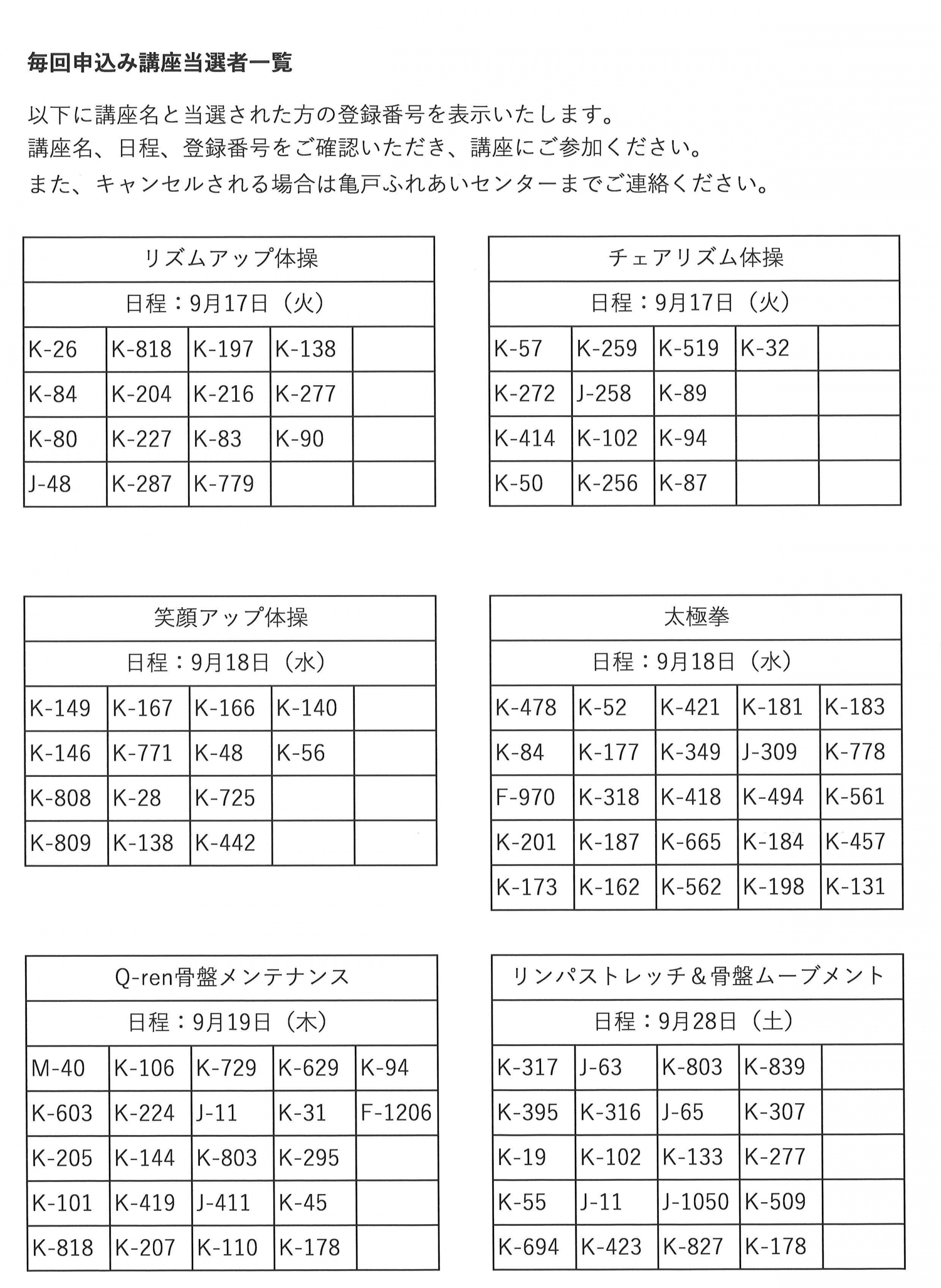 9月後半開催毎回申込講座 当選連絡その1【体操講座】