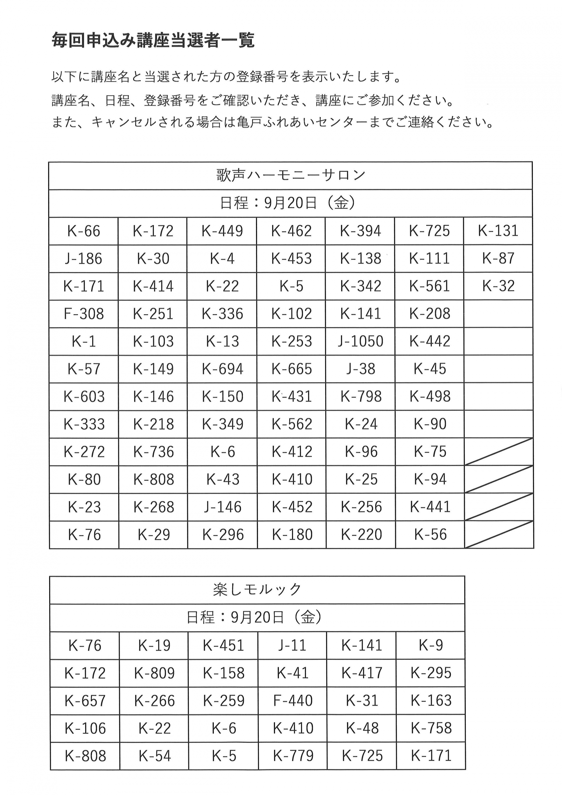 9月後半開催の毎回申込み講座の当選発表をいたします。
