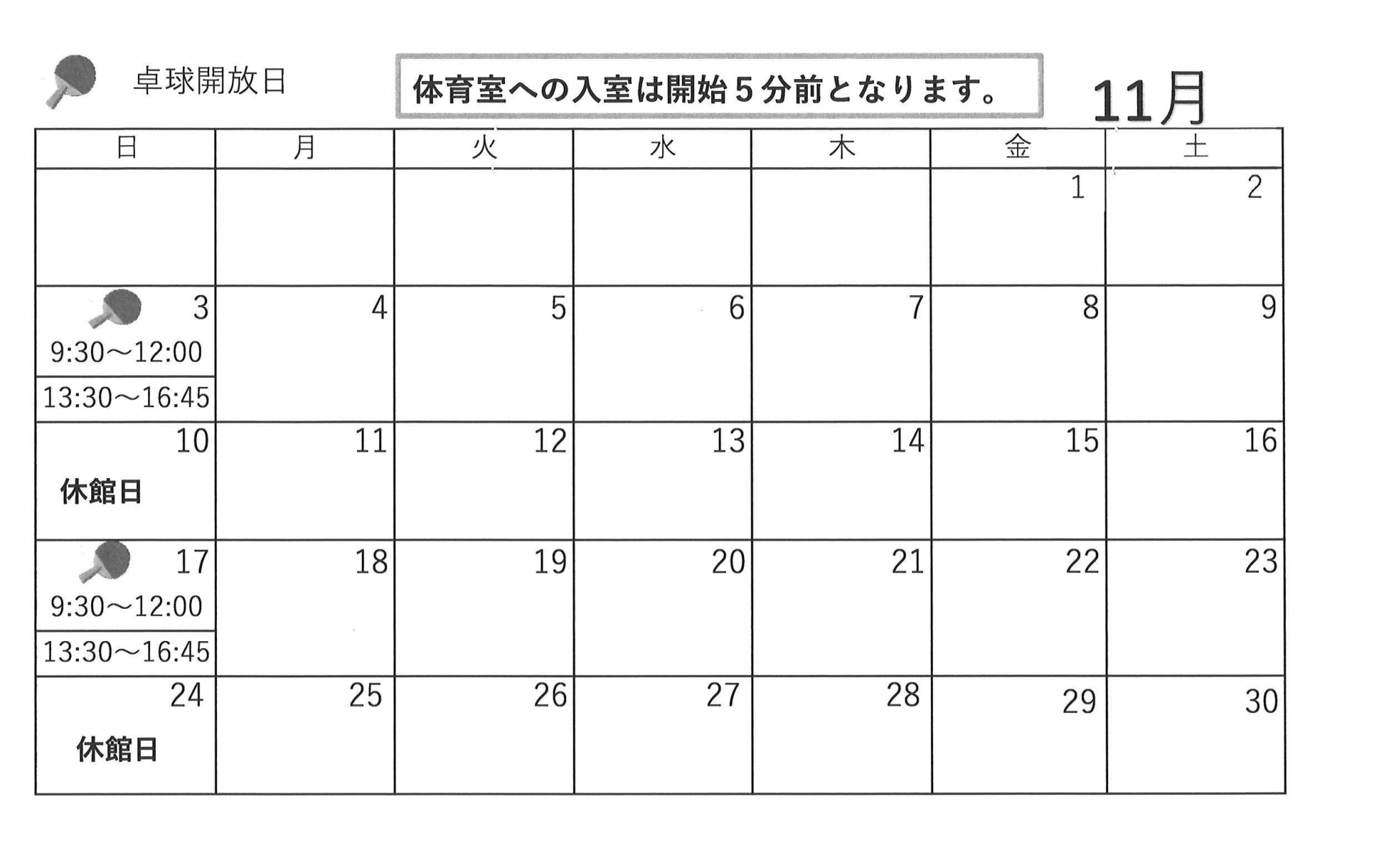 11月自由参加【ゆうゆう体操、カラオケ自由開放、卓球自由開放】日程表