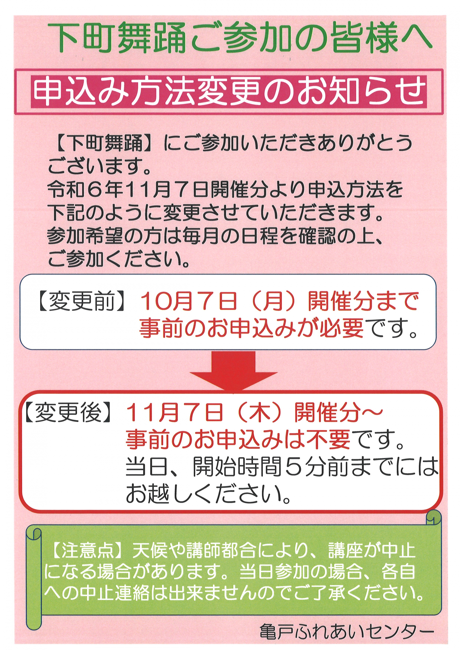 一部講座【下町舞踊・ぬり絵サロン・ちぎり絵サロン】の申込方法変更のお知らせです。